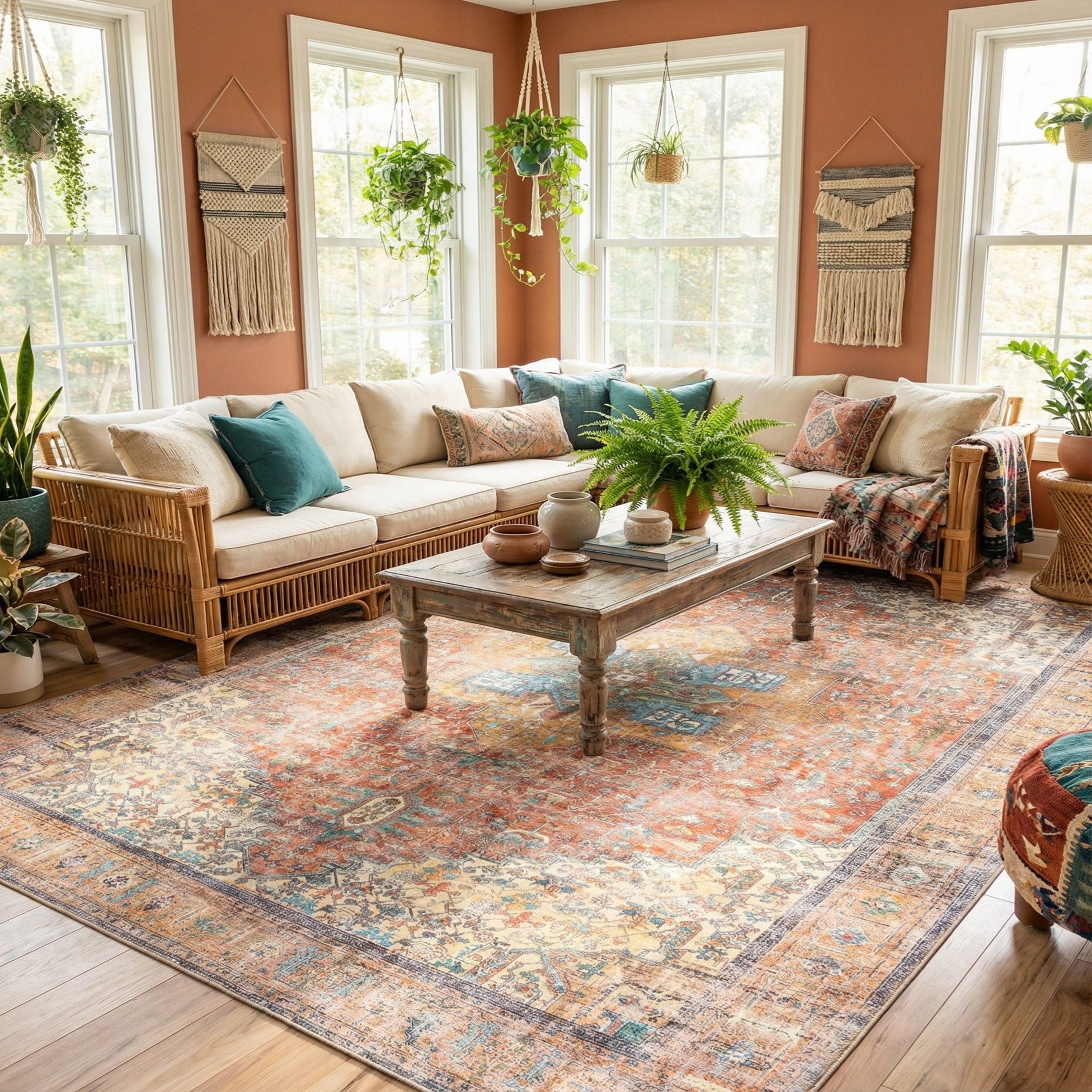 Primary color is Rust Red. Colors in this rug include: Rust Red, Beige, Black, Yellow, Green, Violet, Blue.