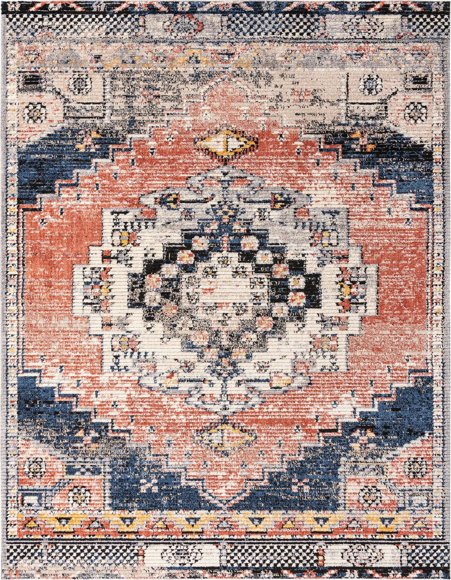 Primary color is Rust Red. Colors in this rug include: Rust Red, Beige, Gray, Ivory, Red, Yellow, Navy Blue.