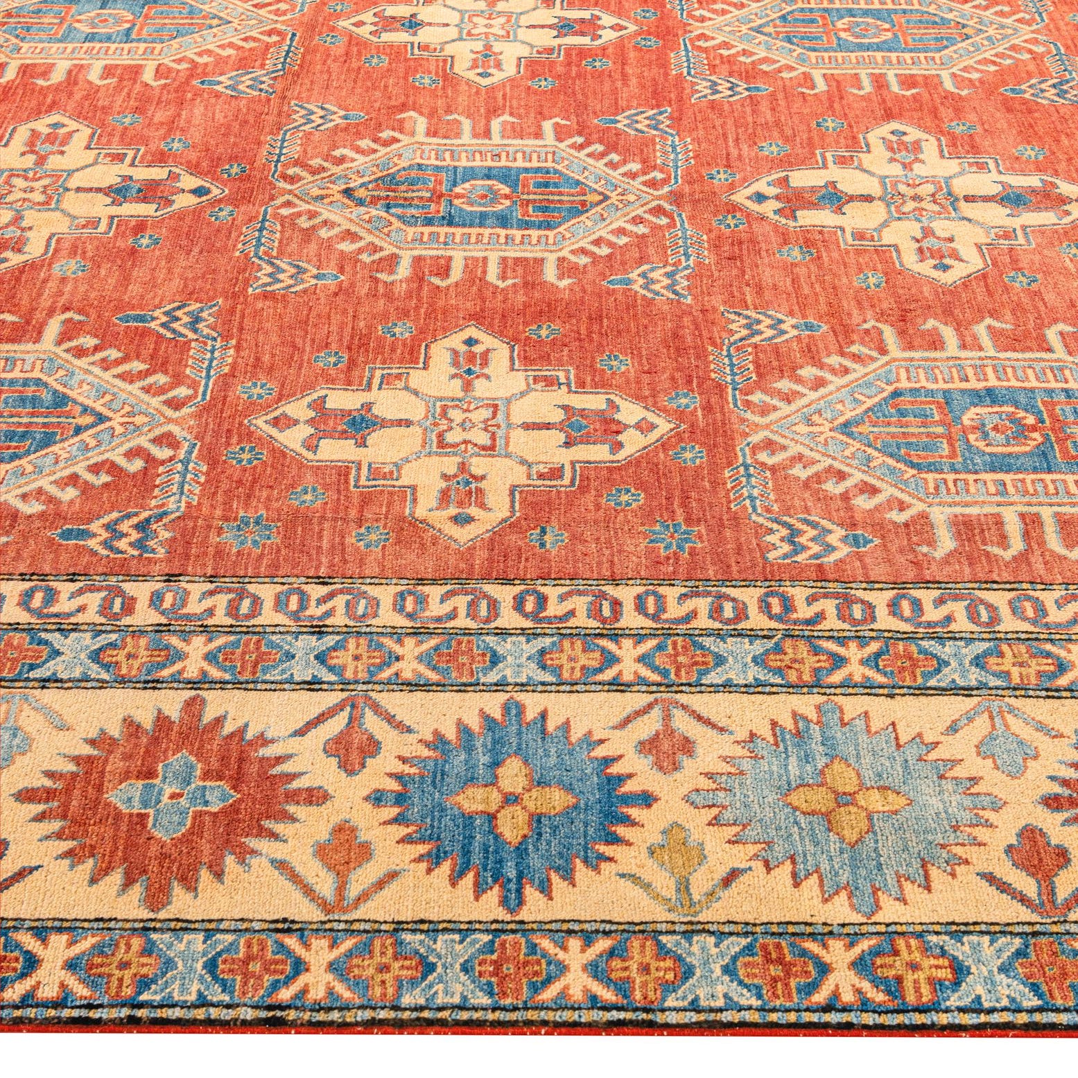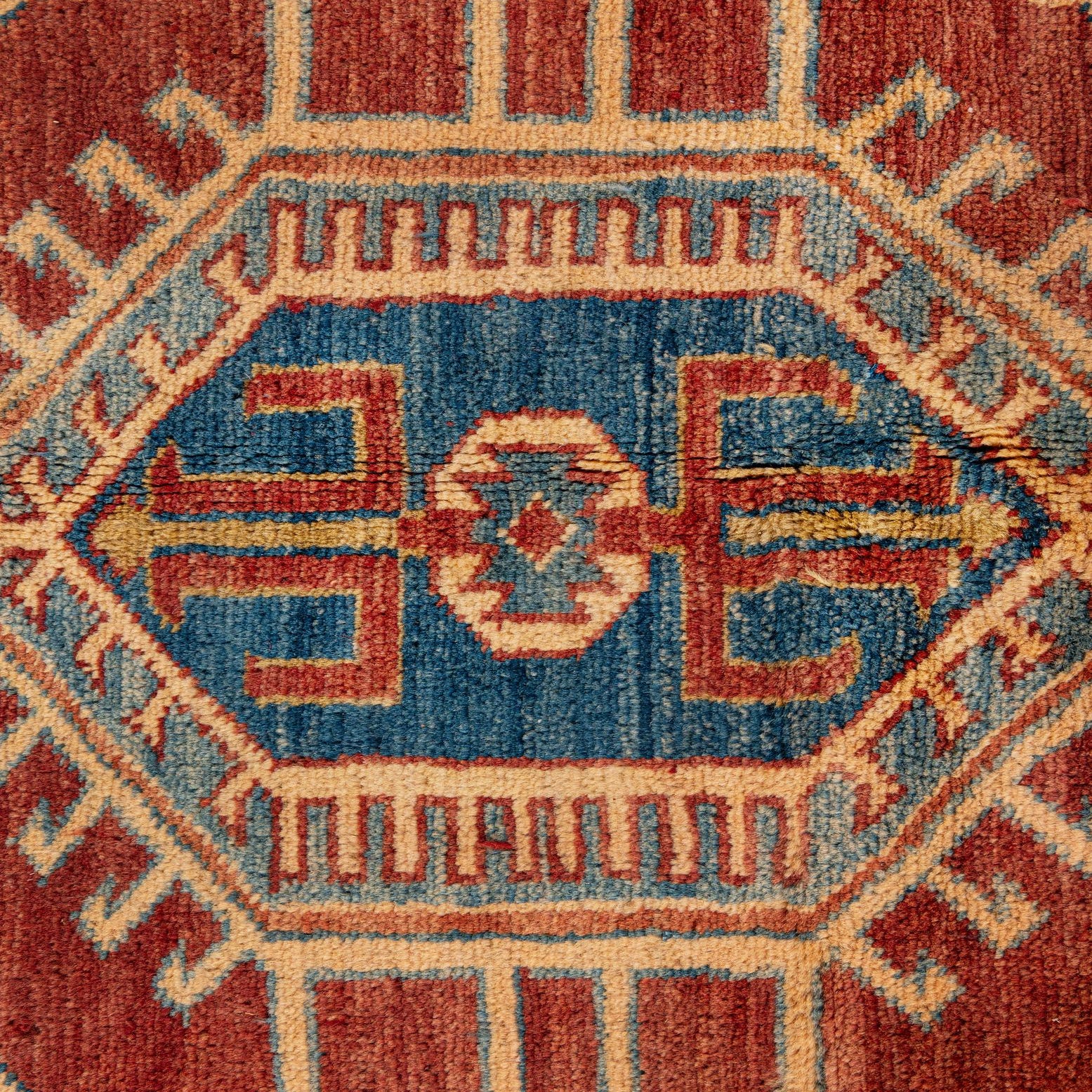 A warm rust red field sets the tone for this hand-knotted, 100% wool rug, where repeating geometric medallions and cross-shaped motifs create a balanced, orderly pattern. Soft beige anchors the central motifs while blue and light blue accents bring cool contrast to the composition; touches of brown and yellow add depth and a muted, vintage character. A cream-beige border patterned with star and rosette motifs frames the rug, giving it a defined edge that complements the central repeat without overwhelming it. The pile feels dense and slightly springy underfoot, with a subtle woolly sheen and a hand-knotted texture that invites touch.