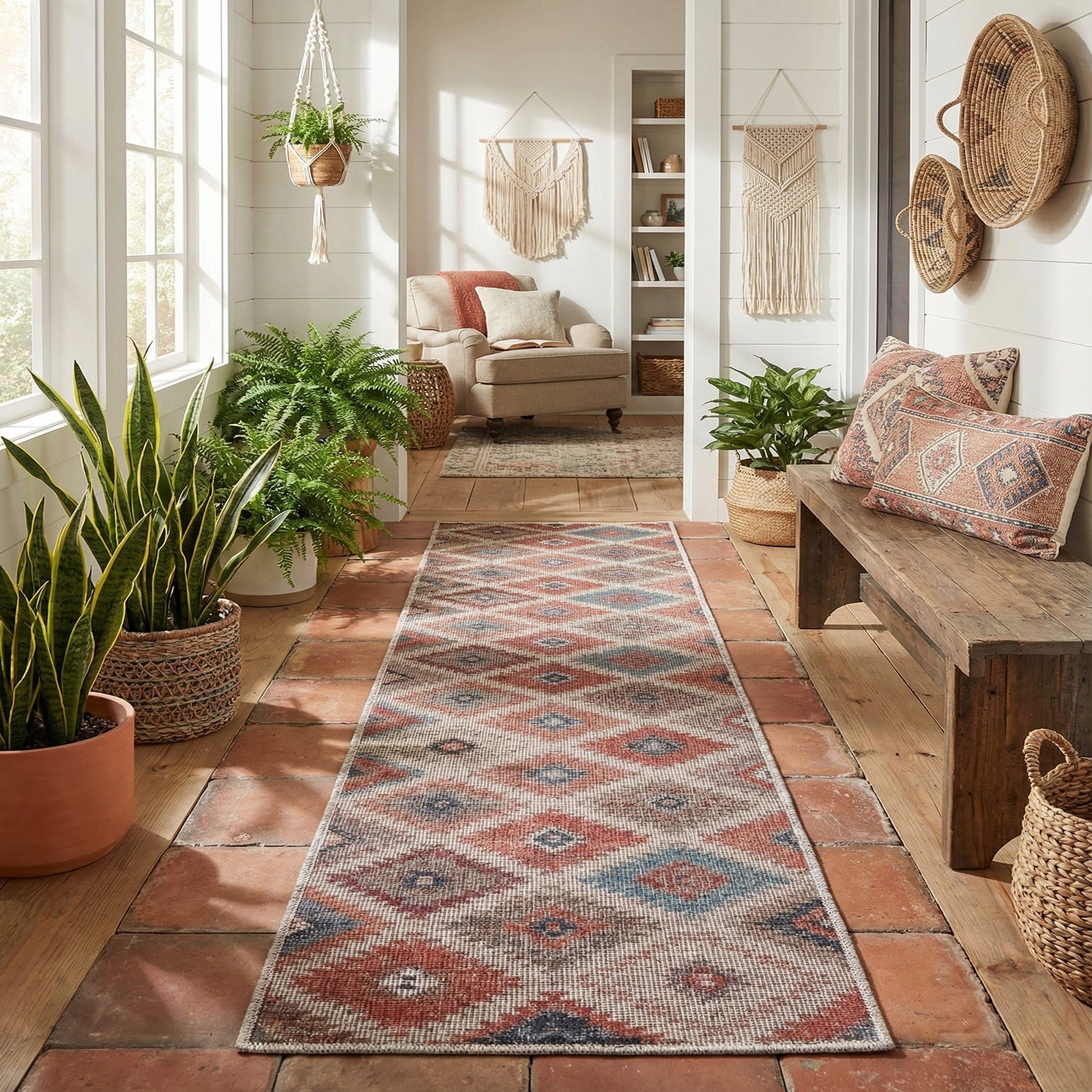 A 10 ft runner rug featuring a Southwestern tribal pattern in rust red, beige, and touches of blue, ideal for a hallway.