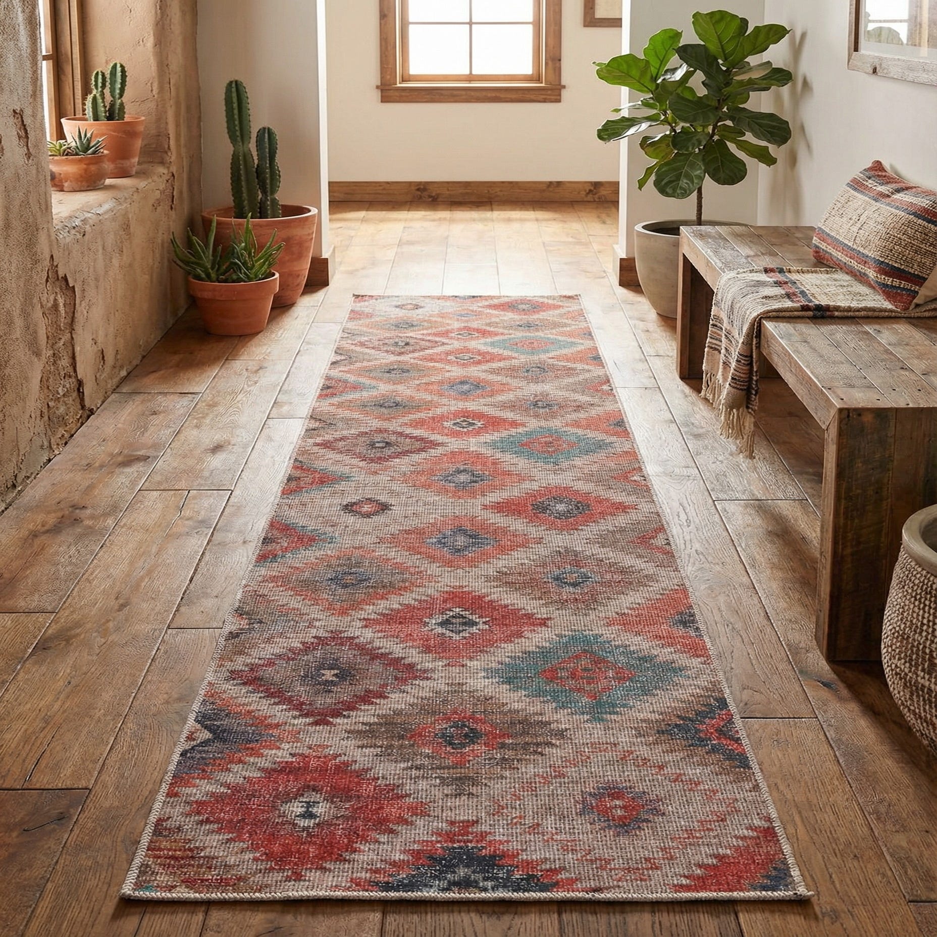 Machine-made of polyester chenille, the surface has a soft, velvety hand and a low-profile texture that sits close to the floor. Place this runner in a long hallway or entry to introduce color and pattern without overwhelming the space, or run it alongside kitchen cabinets to warm tile or hardwood. It pairs naturally with warm wood tones and leather, navy-painted cabinetry or neutral sofas, and complements transitional, farmhouse, southwestern, or bohemian interiors.