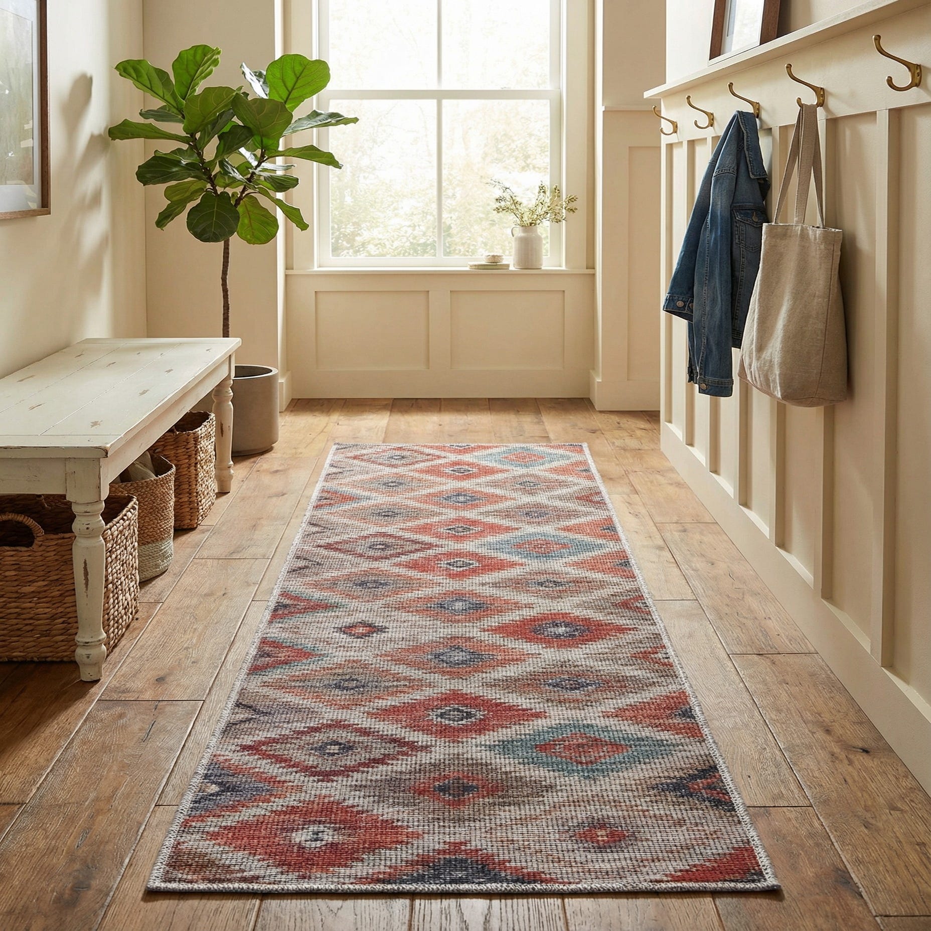 Use this runner to add warmth and pattern to a hallway or entry, bring color to a kitchen galley, or layer it in a casual living area or bedroom for added interest. It pairs naturally with warm wood tones, leather seating, and neutral linens to emphasize the rust and brown hues, while navy or blue accents in pillows, throws, or artwork will pick up the cooler highlights. The overall look complements rustic, farmhouse, bohemian, and transitional interiors where a cozy, patterned runner can anchor the space.