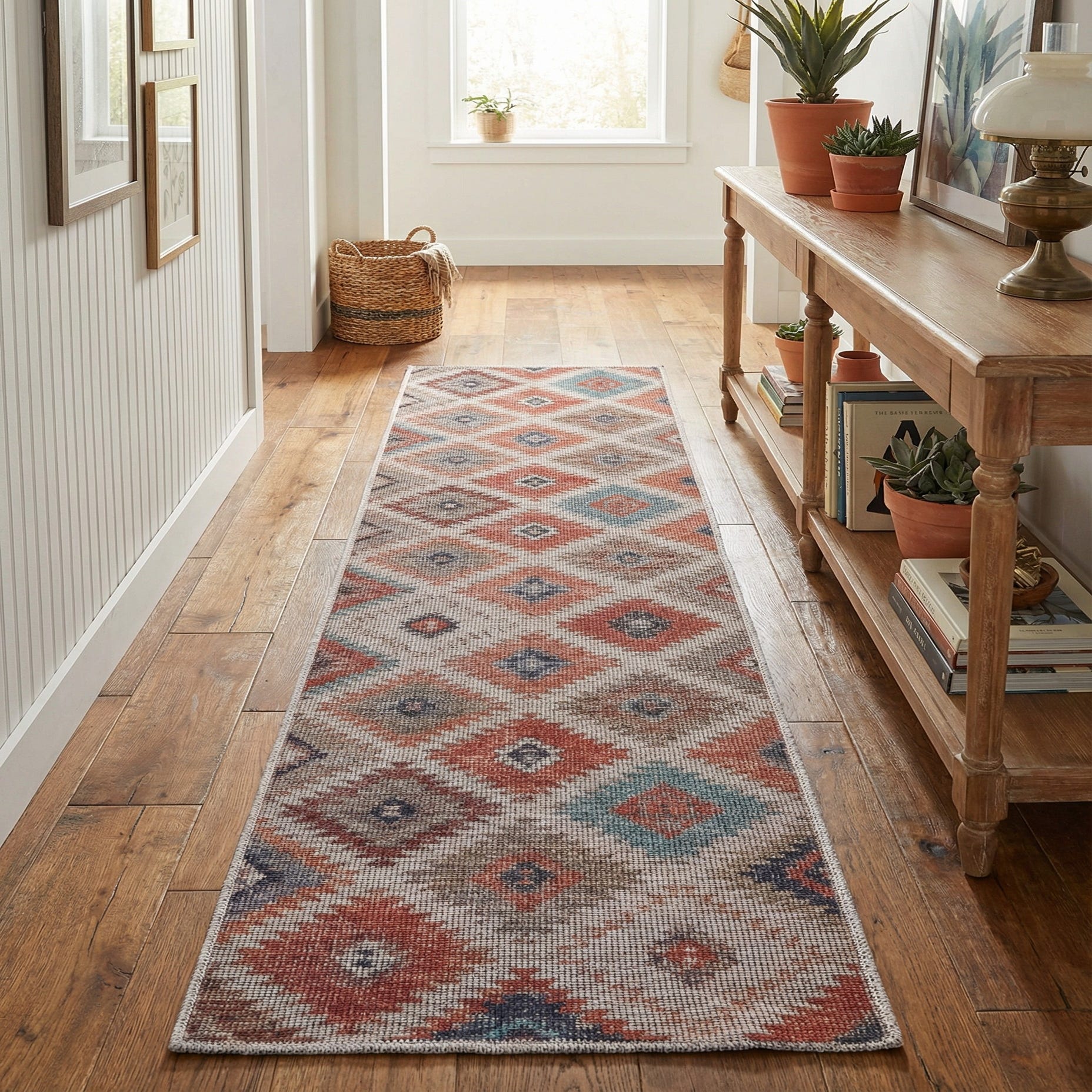 This rug works well in narrow spaces where color and pattern can make a big impact — think entryways, hallways, or alongside a kitchen island. It pairs naturally with warm wood flooring, leather or neutral upholstery, and navy or blue accents; its palette and pattern suit transitional, boho, farmhouse, or southwestern-inspired interiors. Use it to add visual rhythm and warmth to a corridor or to anchor a layered rug layout in a living area.