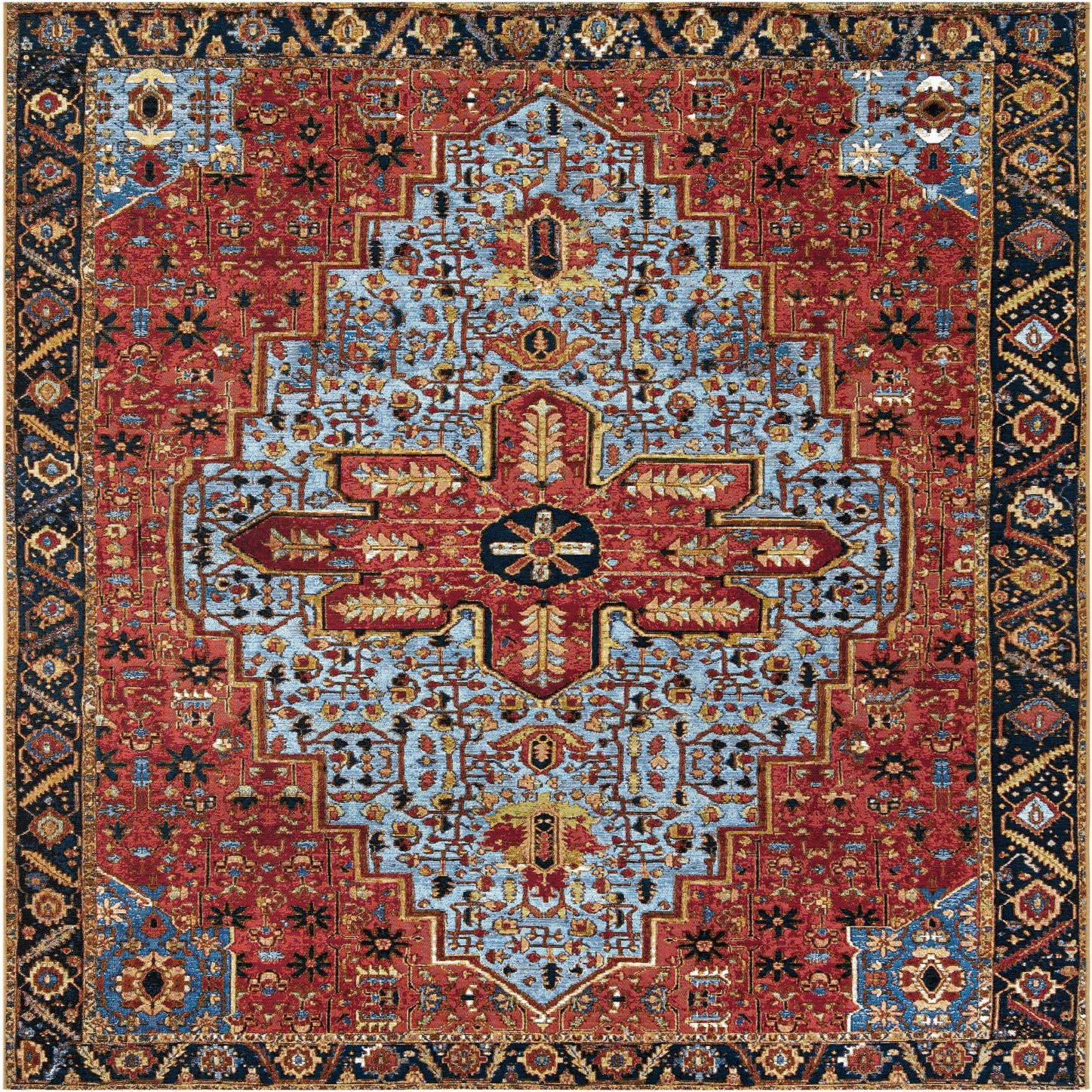 A bold stepped medallion anchors this traditional design, with a pale blue centerpiece set into a rich rust-red and blue field. Intricate floral vines and small-scale motifs thread across the surface in ivory, navy blue, yellow and brown, while a navy blue border of repeating geometric and floral elements frames the composition. The pattern has an aged, heritage feel that reads like a classic Persian-inspired rug but with clear, crisp detailing and contrasting color pops.