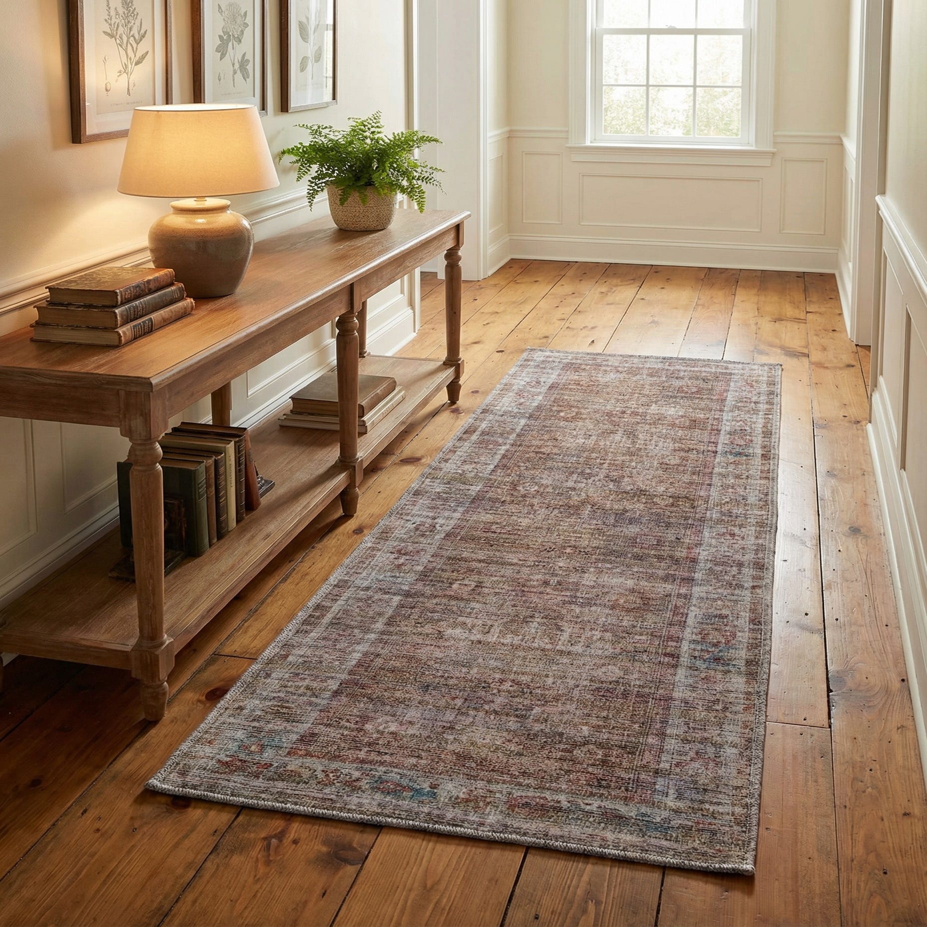 Place this runner in a hallway or entry to warm a narrow circulation path, or layer it in front of a sofa or bed to introduce subdued color and pattern. It pairs well with warm wood finishes and neutral upholstery and complements transitional, farmhouse, bohemian, or vintage-inspired interiors. The relaxed, timeworn appearance makes it an easy anchor for both traditional and more contemporary arrangements.