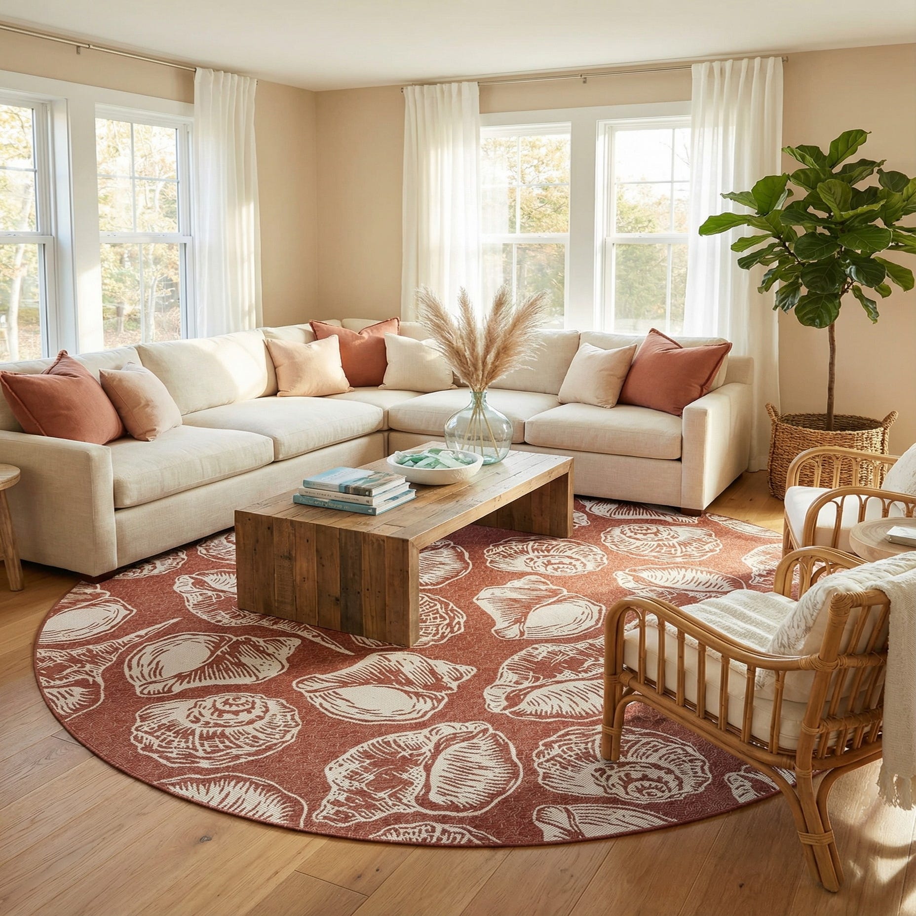 A 12-foot round outdoor rug featuring a rust red background with an ivory seashell pattern, perfect for a patio.