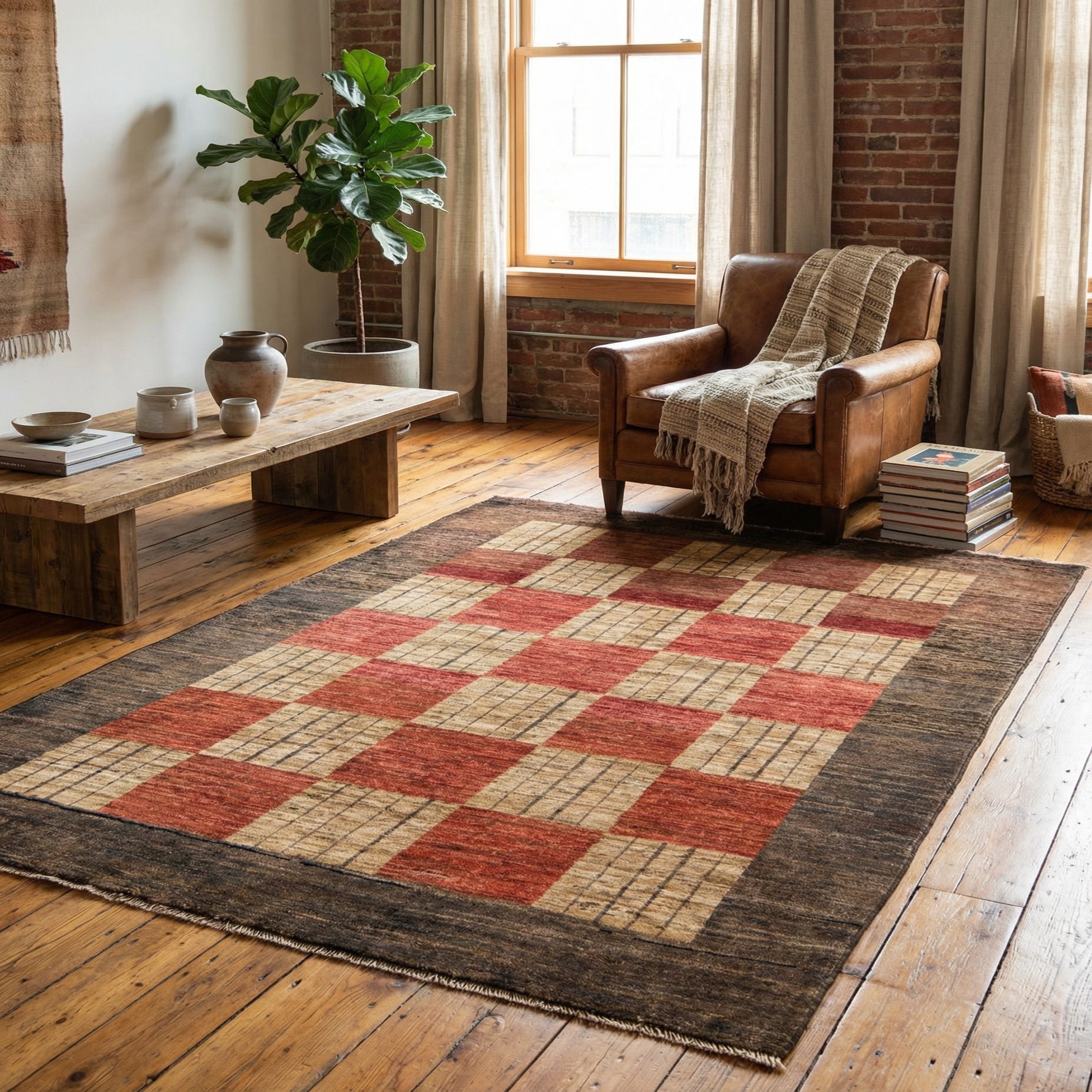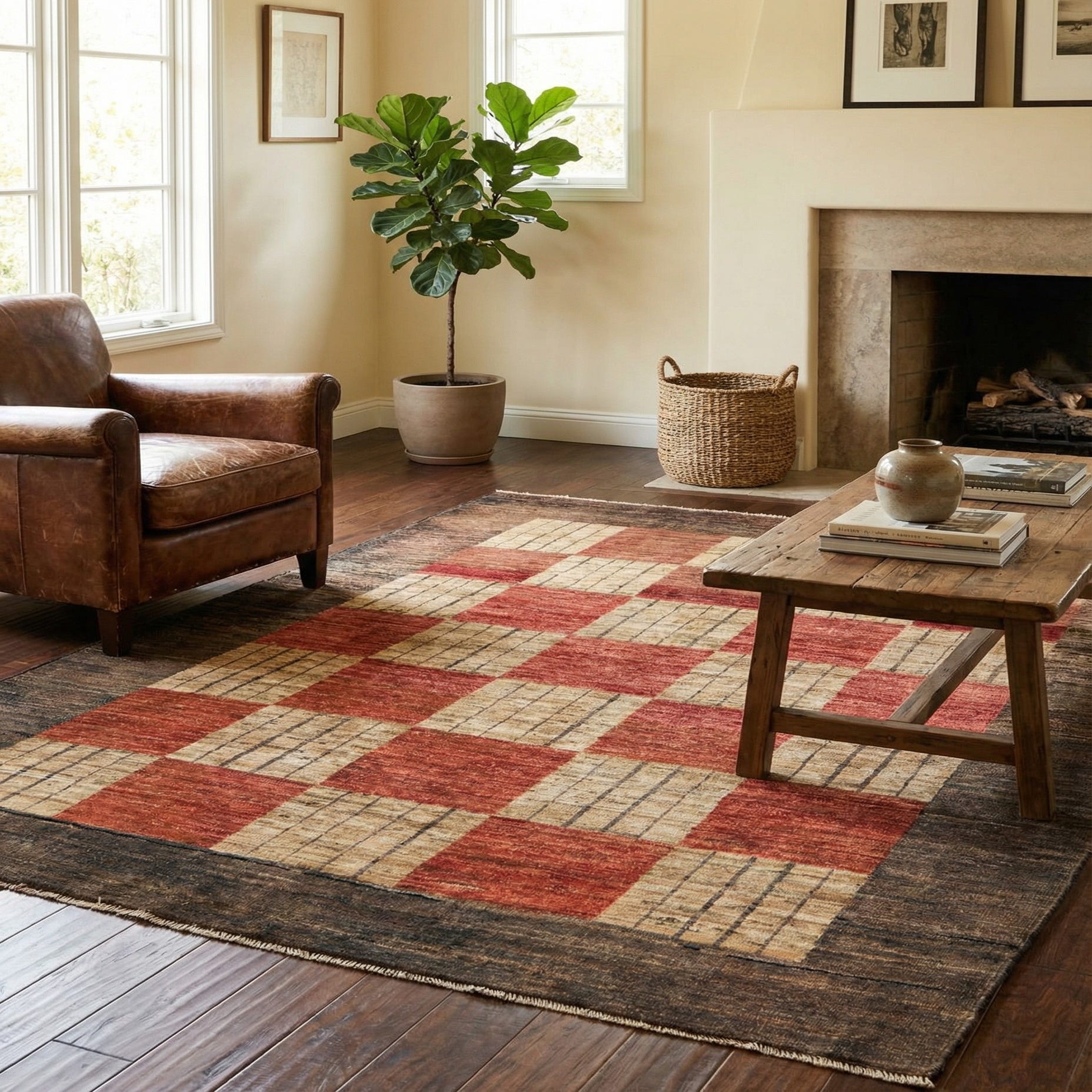 This Modern Ziegler 4x6 area rug presents a bold geometric pattern with a sophisticated array of colors including Rust Red Beige, Beige, Ivory, and accents of Rust Red, all set against a warm Rust Red Beige background. The rug features a checkerboard layout that creates a sense of structure and balance, enhancing the hand-knotted craftsmanship made from 100% hand-spun wool. The wool's natural texture adds a tactile dimension to the rug's surface, conveying a sense of authenticity and comfort underfoot.
