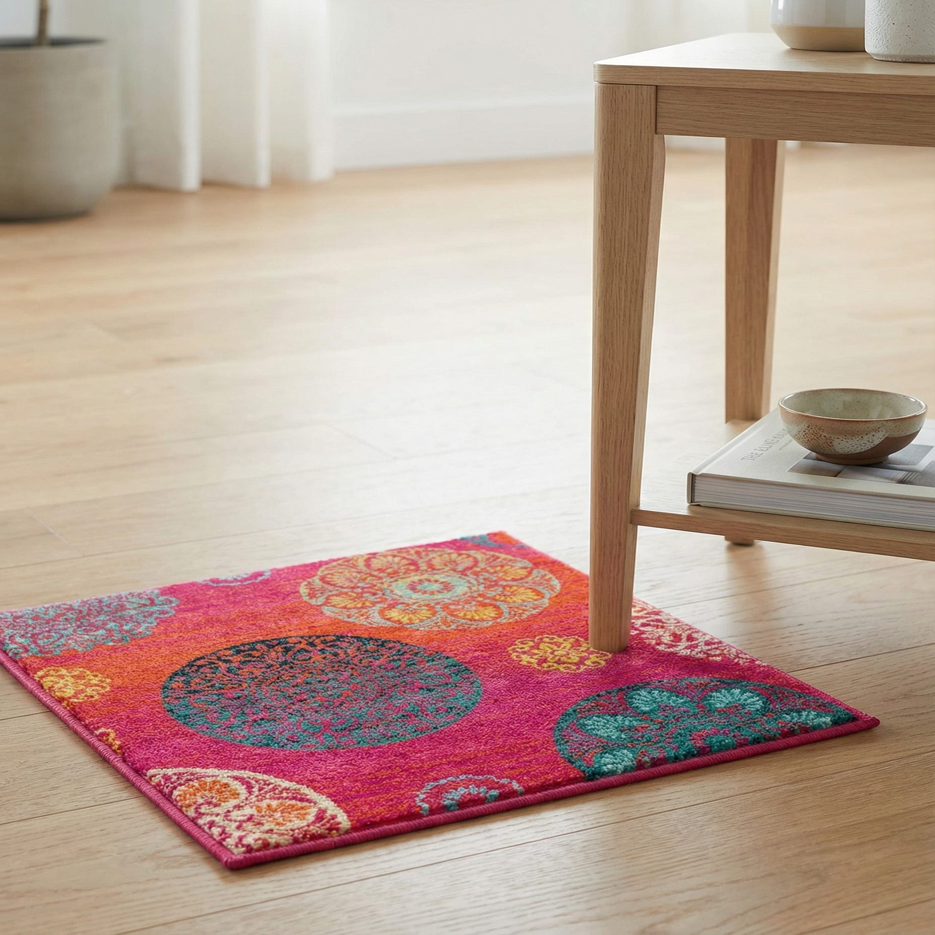 Machine Made of 100% Polypropylene, this Sample piece brings bold color and pattern to a range of interiors. It fits well in a lively living room as an anchor beneath neutral seating, in a child’s or teen’s room for a playful backdrop, or layered into a bohemian or eclectic scheme with textured throws and natural woods. Pair it with muted walls and warm wood tones to let the rust red and turquoise pop, or combine it with painted furniture and mixed-pattern accents for a collected, energetic look. This piece is a Sample.