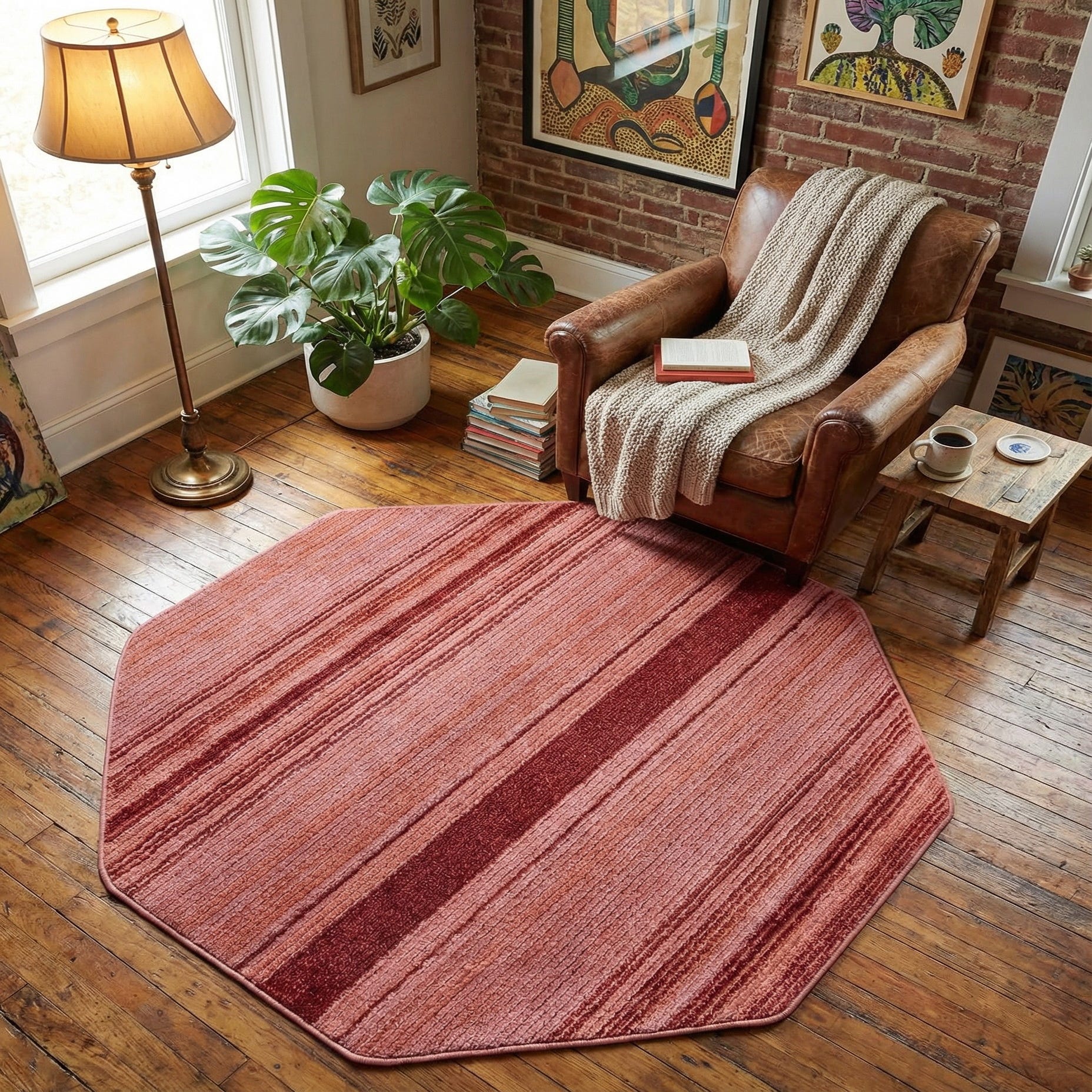 This shape and palette work well as an anchoring accent in a cozy reading nook, beneath a pair of lounge chairs, or layered in a bedroom seating area. Pair it with warm wood tones, linen upholstery and matte metal accents for a contemporary or mid-century look, or combine with natural textures like woven baskets and soft throws for a relaxed, boho vibe. The warm pinks and rich red accents also make it an easy way to introduce color into a neutral living room or entry where a structured yet soft focal point is needed.