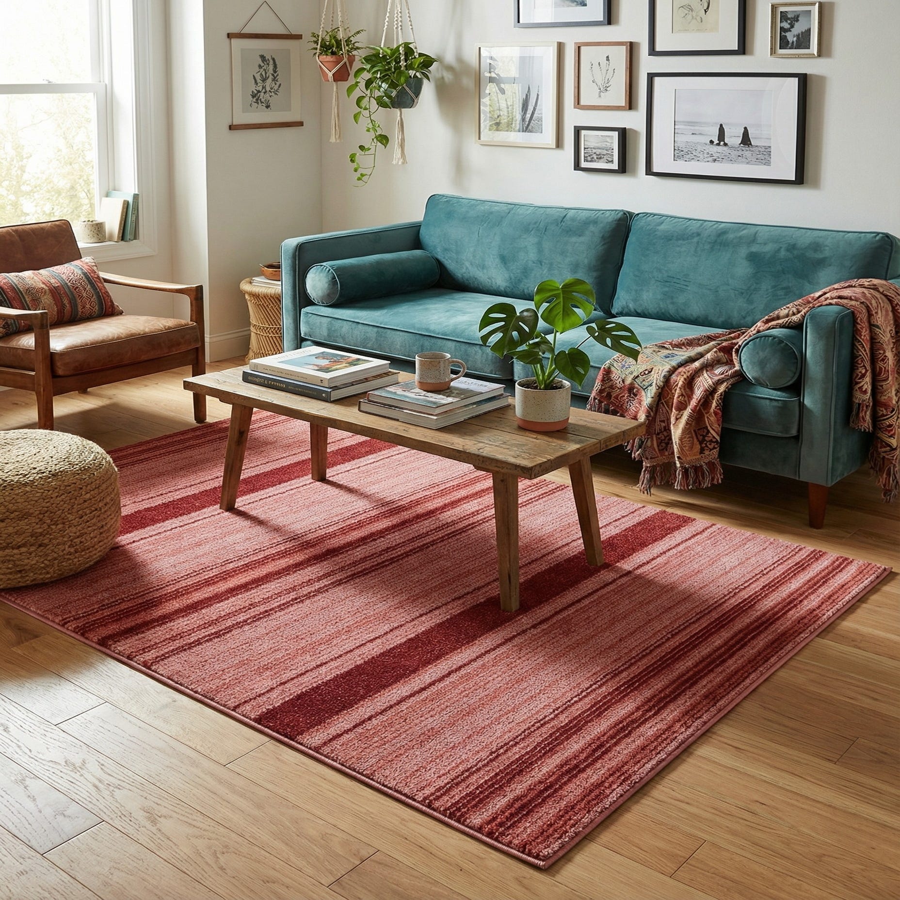Warm, horizontal banding defines this design in a layered mix of Rusty Pink Rose with accents of Red and lighter Pink. Narrow, closely spaced striations alternate with broader, saturated bands to create a calm, linear rhythm across the surface—two deeper red bands act as visual anchors while the surrounding tones soften the overall look. Machine-made from polypropylene, the rug has a dense, cut-pile hand that feels cushioned yet low-to-medium in profile, delivering subtle texture you can both see and feel underfoot.