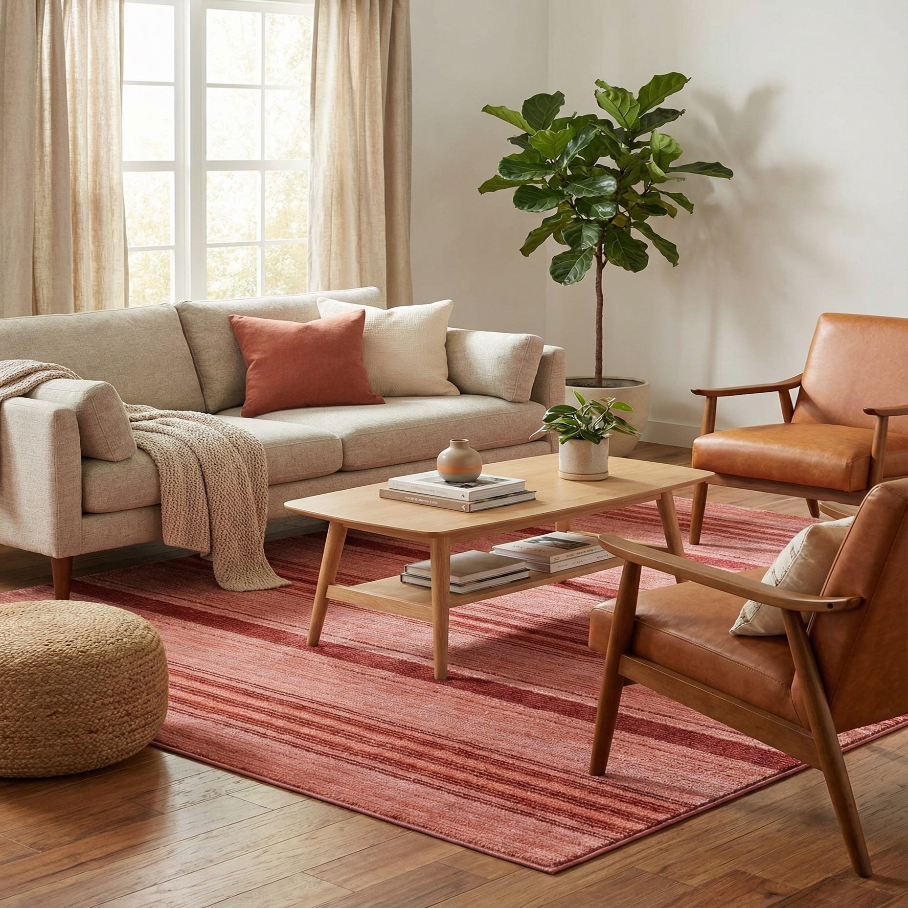 This rug fits well in contemporary and transitional spaces where color and texture play central roles. Place it under a coffee table to anchor a living room with warm wood furniture and brass or matte black accents, layer it in a casual bedroom to add a cozy blush palette, or use it to bring color to a home office or reading nook. Its linear design pairs nicely with mid-century silhouettes, neutral upholstery, or patterned throw pillows that pick up the red and pink tones.