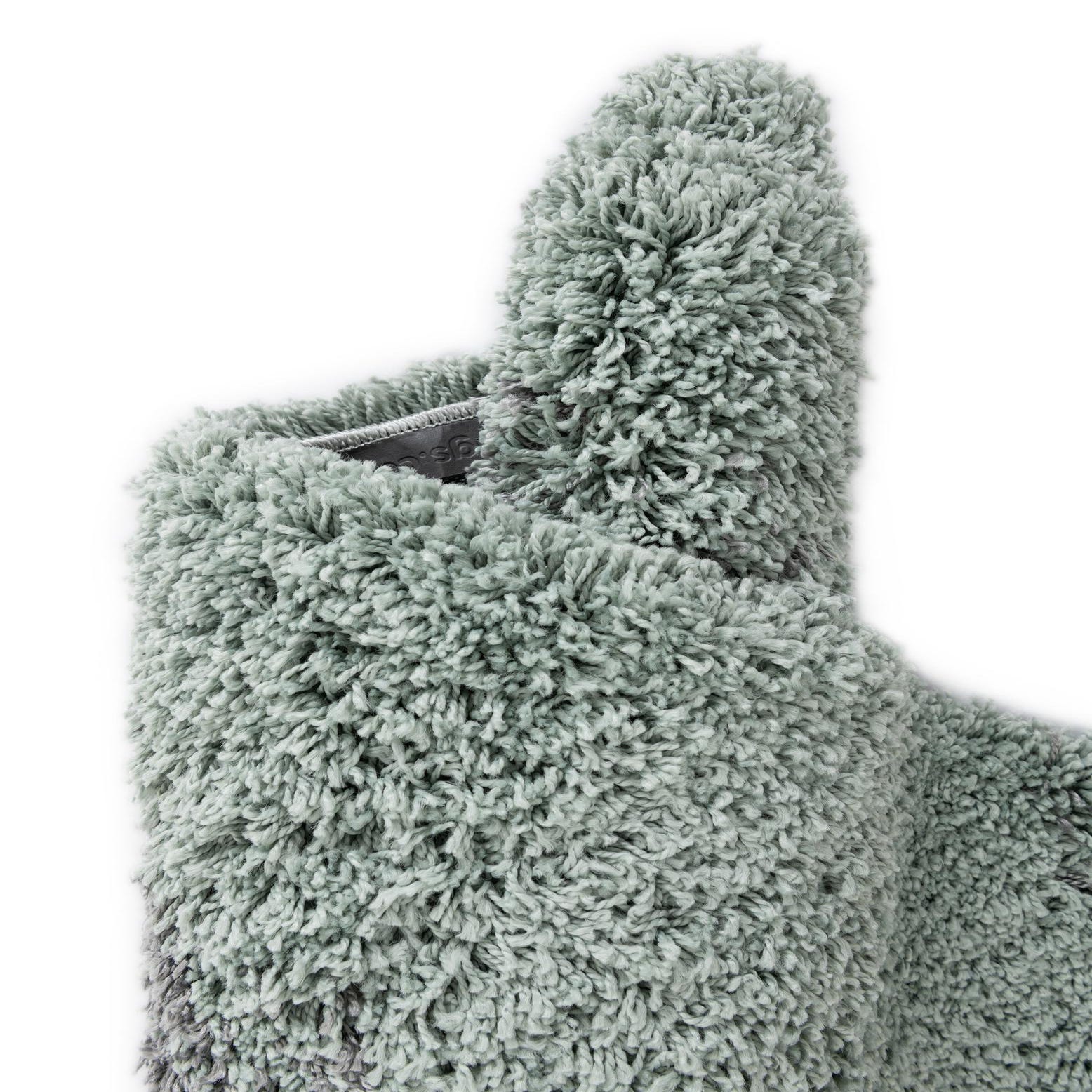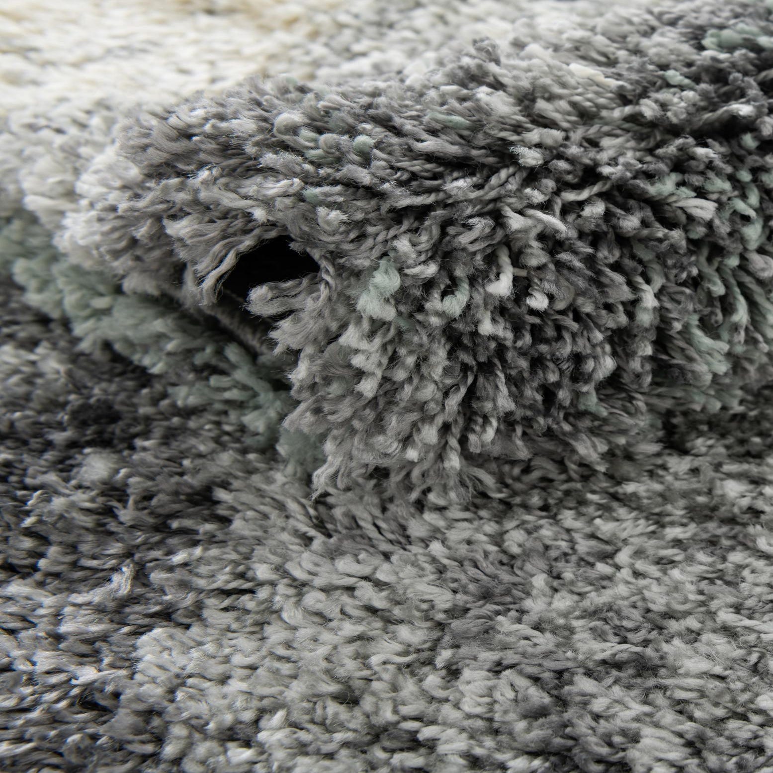 Soft, sculpted shag fibers form a flowing, wave-like pattern across a sage green ground, where bands of gray and ivory blend into soft gradients for an organic, abstract look. The high-pile surface invites touch — plush strands lift slightly when pressed and return with a gentle spring — giving noticeable depth and a cozy feel underfoot. Machine-made of 100% polypropylene, the construction delivers a consistent pile and color saturation throughout the rug.