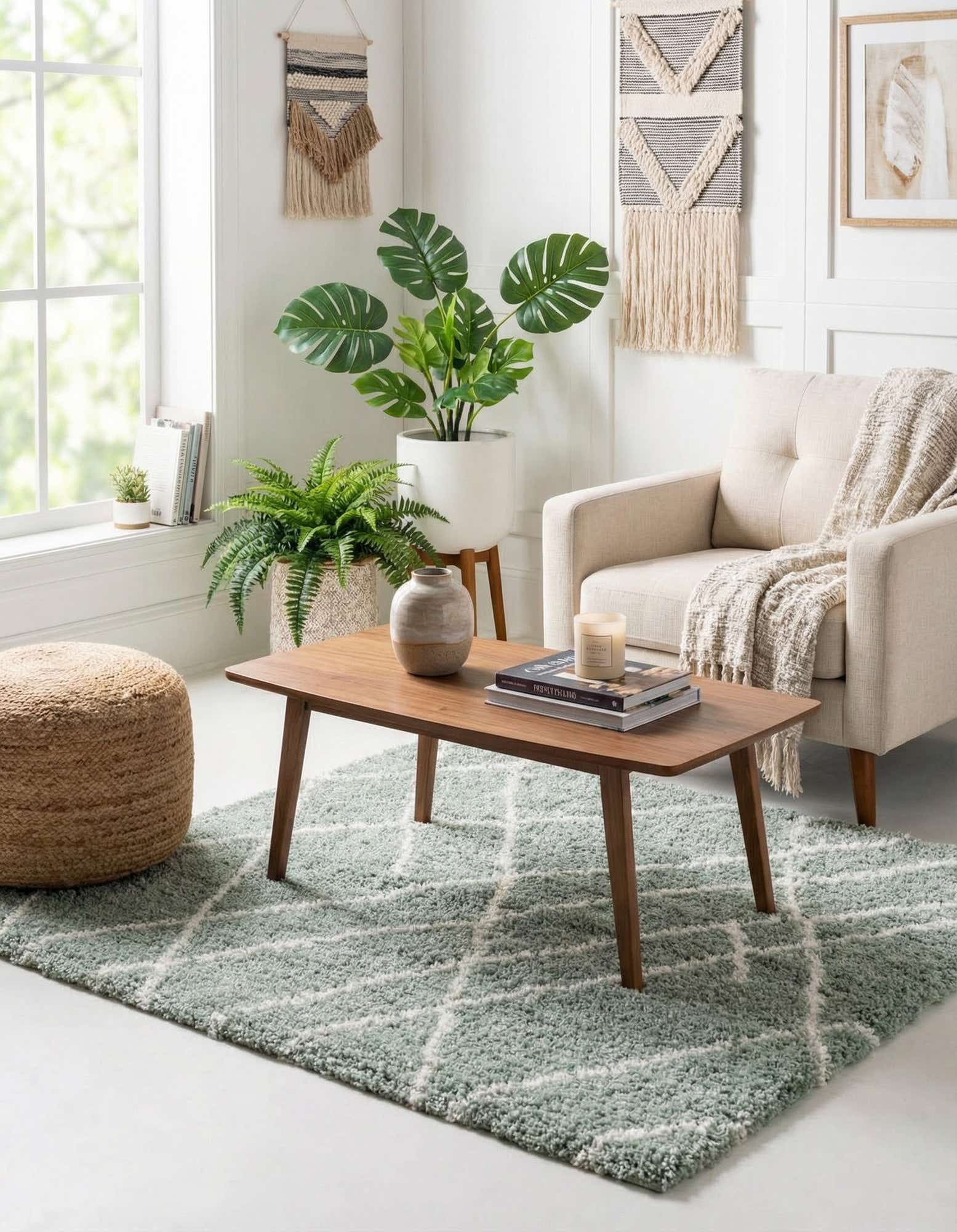 Use this rug to anchor a cozy bedroom arrangement, soften a small living room seating area under a low coffee table, or add a comfortable layer to a nursery or reading nook. The muted sage and ivory palette pairs neatly with light woods, rattan, and linen upholstery, working well in Scandinavian, coastal, modern farmhouse, or contemporary transitional interiors.