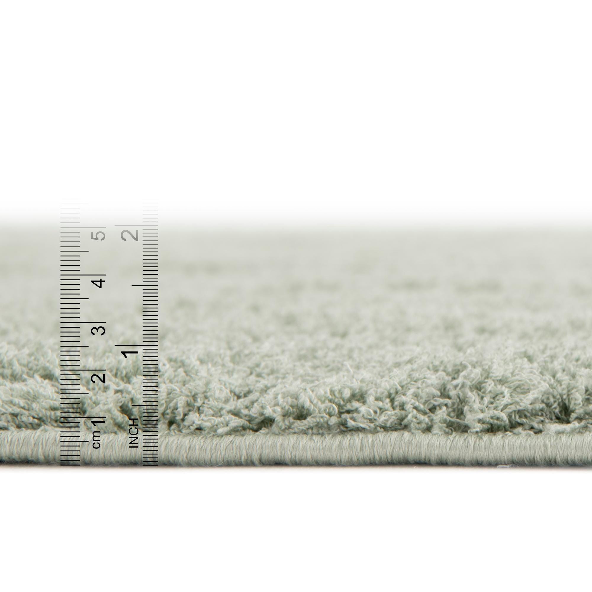 A solid sage green shag with a clean, even surface, this rug offers a plush, cushiony pile that invites bare feet. Machine made from 100% polyester, the fibers have a soft, velvety hand and a low-matte finish that keeps the look understated while adding tactile depth. The single-color design and dense pile create a calm, uniform field with gentle variations in pile direction that give the surface subtle texture without a patterned motif.