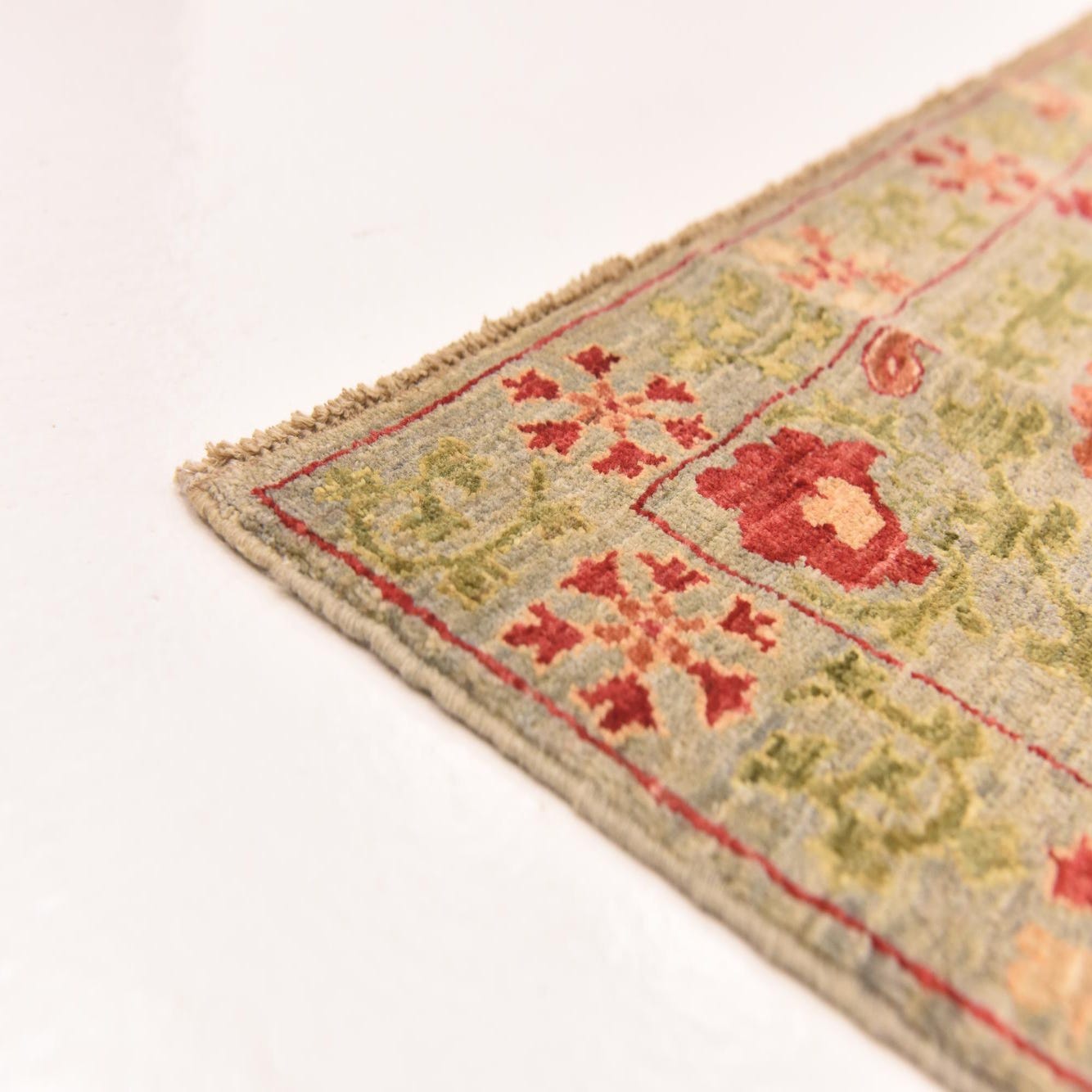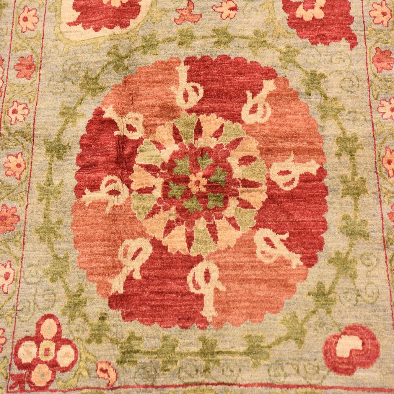 The Ariana Ziegler collection presents an elegant 7x10 hand-knotted rug, crafted from 100% hand-spun wool. This piece showcases a harmonious palette of sage green, which serves as a gentle background to an array of complementary hues including blue, cream, olive, red, salmon, and peach. The design features a traditional motif, encompassing a mix of floral medallions and botanical elements that offer a timeless aesthetic.