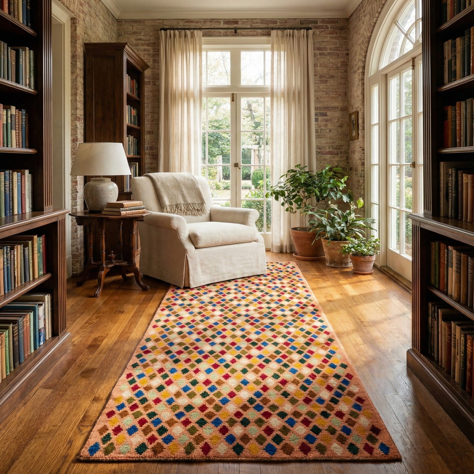 A 10 ft runner rug with a tribal pattern of colorful diamonds in shades of orange, pink, blue, green, yellow, and red on a light orange background.