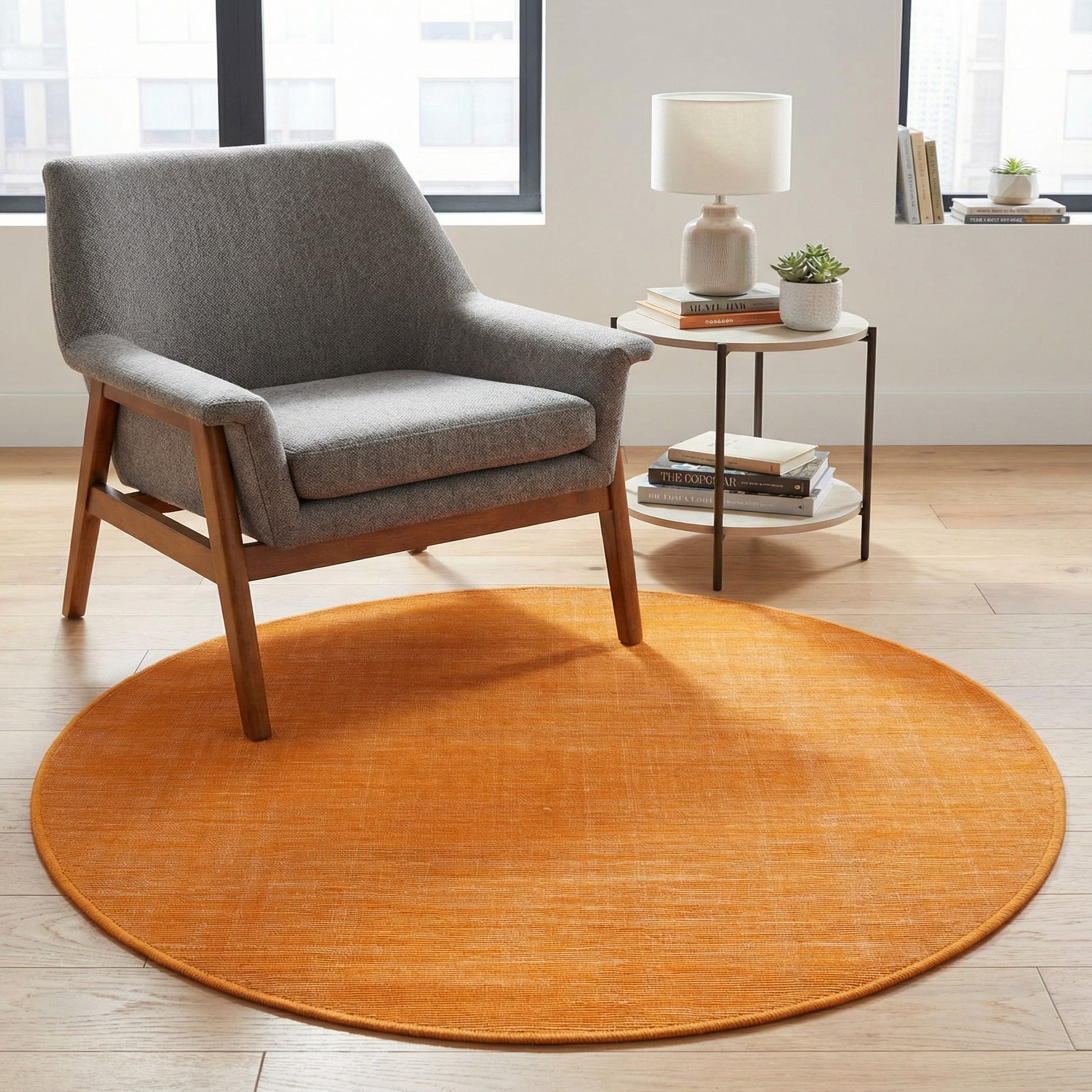 This rug fits well in contemporary, mid-century, or Scandinavian-inspired interiors. Use it to anchor a round dining nook, define a cozy seating area, or add a warm accent at the foot of a bed or in a home office. Pair with natural wood furnishings and neutral textiles for a calm, layered look, or contrast it with deep blues and greens for a more lively palette.