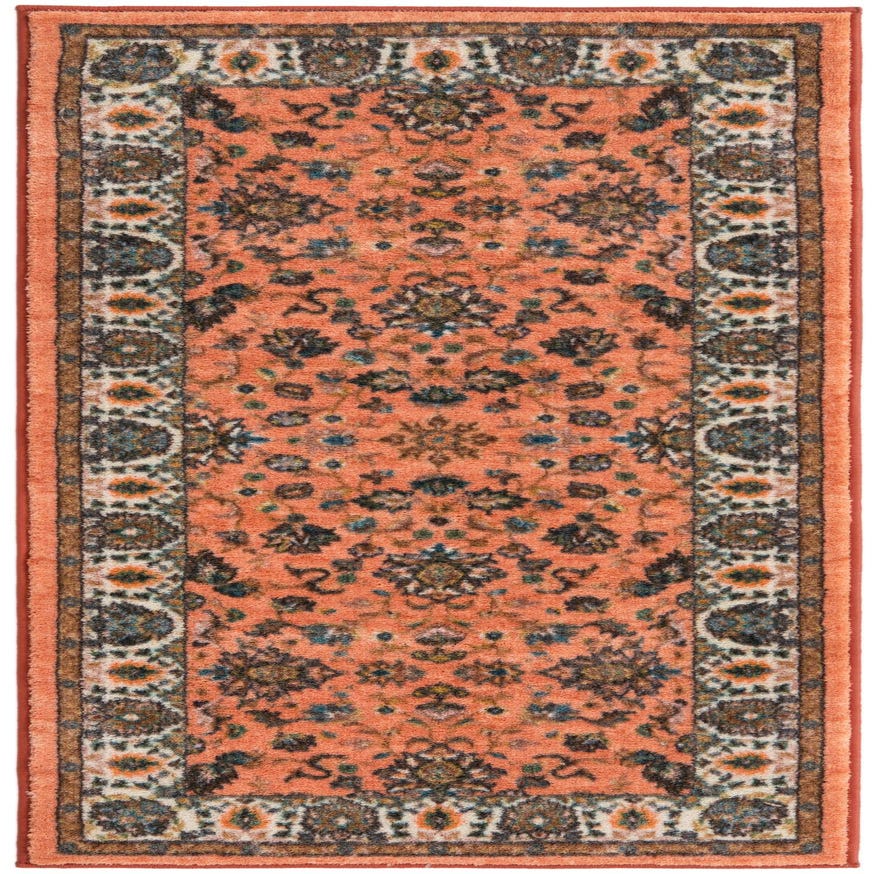 A warm salmon field anchors a traditional, Persian-inspired motif of stylized florals and palmettes rendered in black, blue, light brown, pink and ivory. A narrow ivory border with repeated medallion accents frames the design, creating a balanced, symmetrical layout that feels both classic and approachable. The surface is machine-made polyester with a soft, low-profile pile you can feel underfoot — slightly cushioned with a brushed texture that highlights the pattern’s subtle color variations.