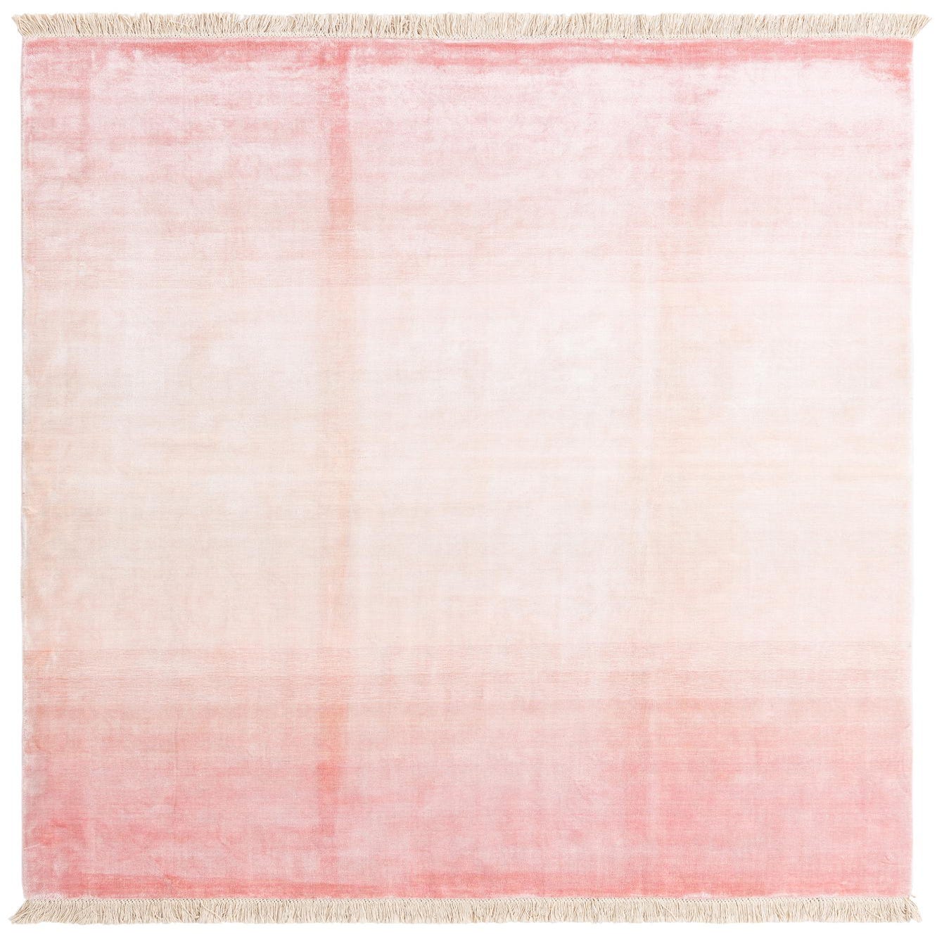 The Darya Collection rug offers a harmonious blend of warm hues, hand-knotted from 100% wool for lasting durability and comfort underfoot. This 5x8 rug presents a subtle, minimalist pattern featuring an ombre effect that transitions smoothly from a rich salmon background to lighter tones of light salmon, peach, and pink, evoking a sense of calm and warmth in any space.