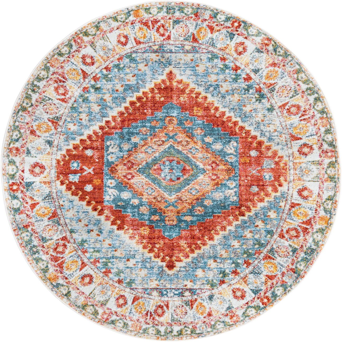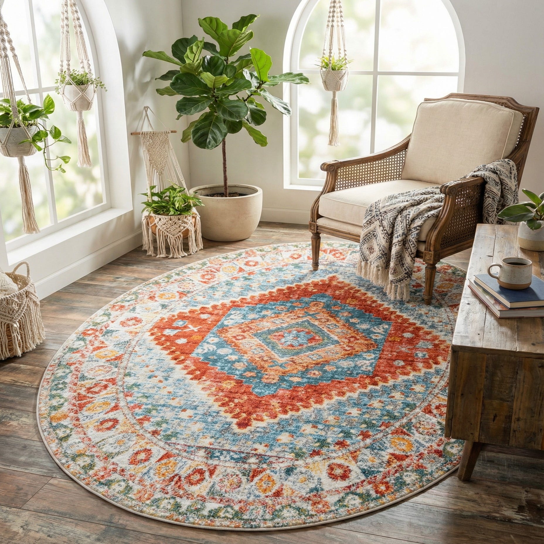 This rug would sit beautifully within a variety of decor scenarios, from a cozy Bohemian den to a more formal sitting area with classic furnishings. Its range of colors affords flexibility in accenting with decorative elements and its ornate design pairs well with minimalist furniture to create visual interest. The calming tones and delicate patterning would also complement a beachfront aesthetic or a country-chic motif, striking a balance between relaxed living and tasteful elegance.