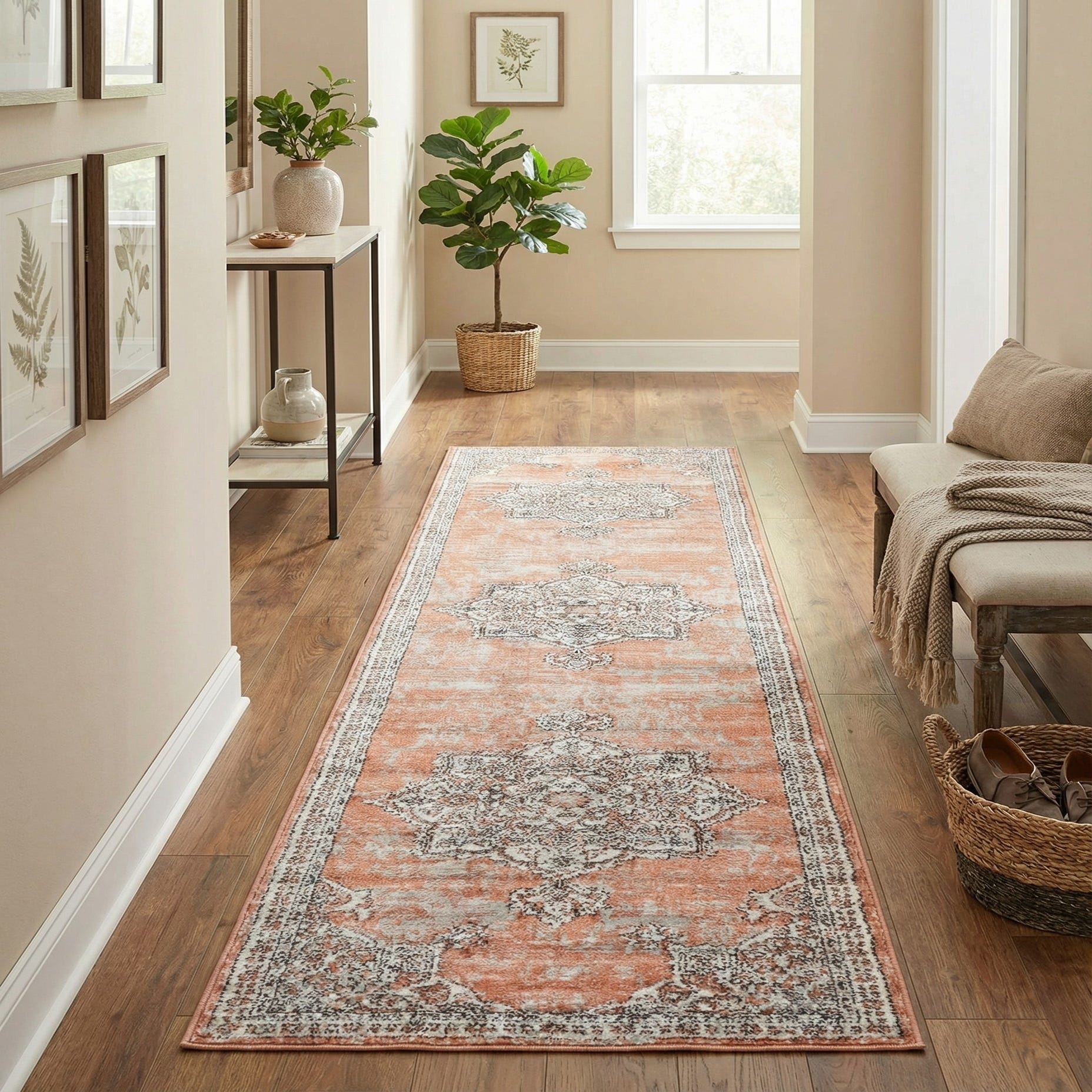 Ideal for a hallway or entryway, the runner also works well in a kitchen galley or alongside a bed to introduce color and pattern underfoot. The salmon pink pairs beautifully with warm woods and rattan, while the ivory, gray, and black details coordinate with neutral upholstery, matte-black finishes, or cool gray textiles. Its blend of traditional motif and relaxed, worn-in texture suits transitional, modern-traditional, and eclectic interiors looking for a touch of color that remains grounded.