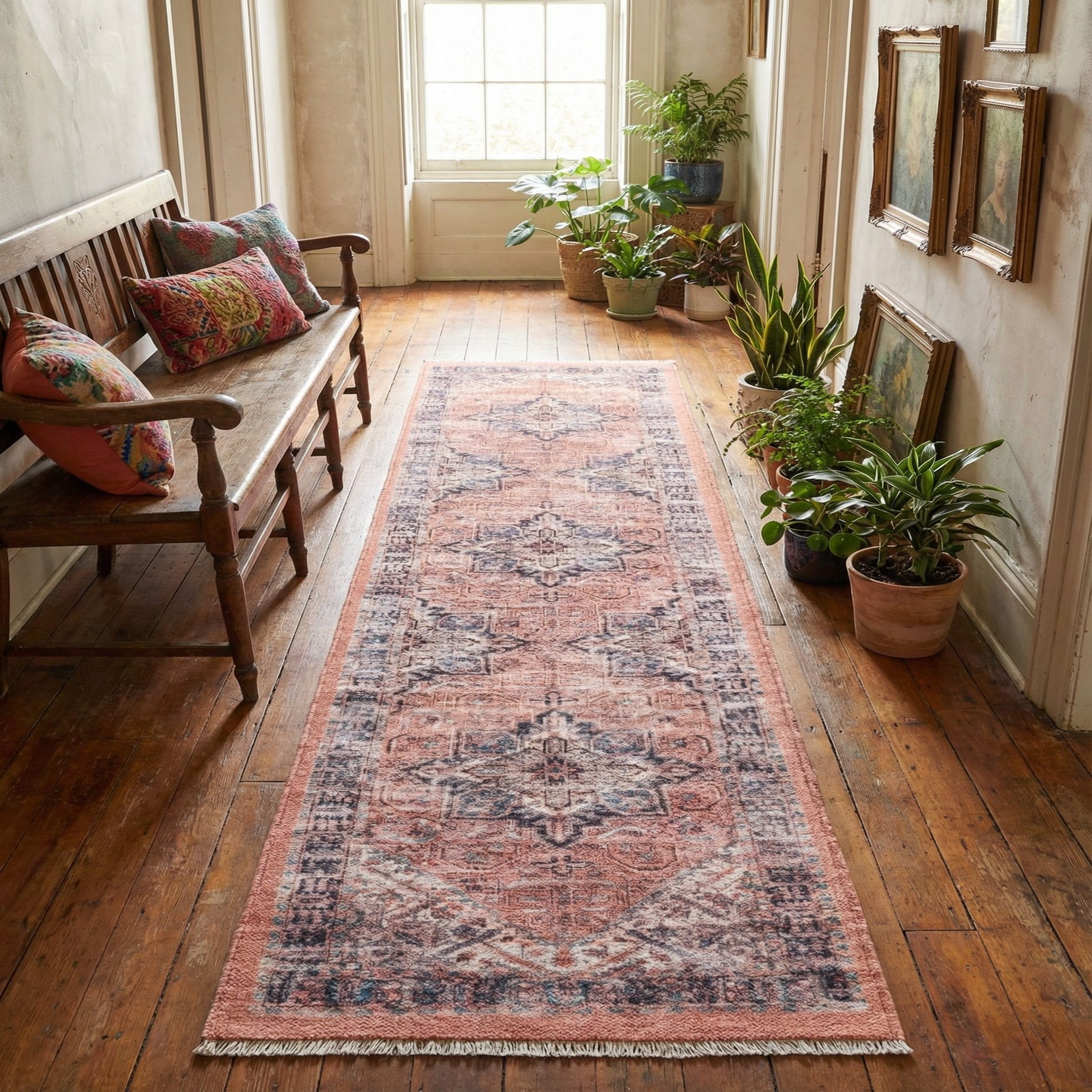 Primary color is Salmon Pink. Colors in this rug include: Salmon Pink, Beige, Blue, Brown, Ivory, Light Blue, Navy Blue.