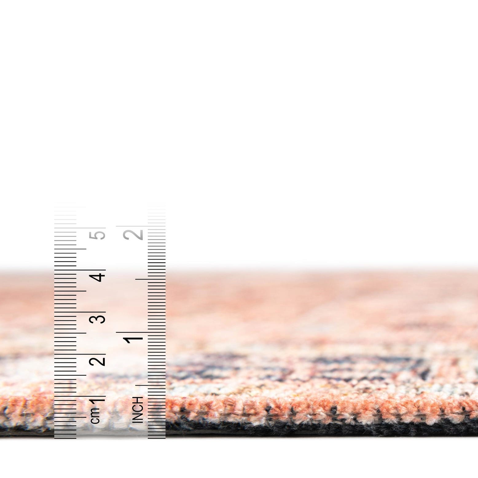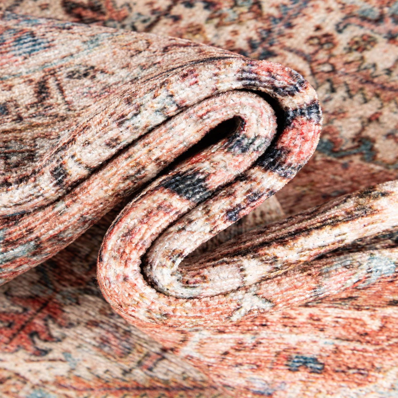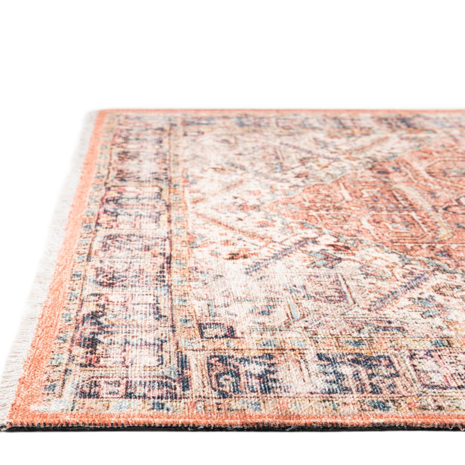 An 8 ft runner rug in shades of orange and pink with a vintage traditional medallion pattern, ideal for a hallway.