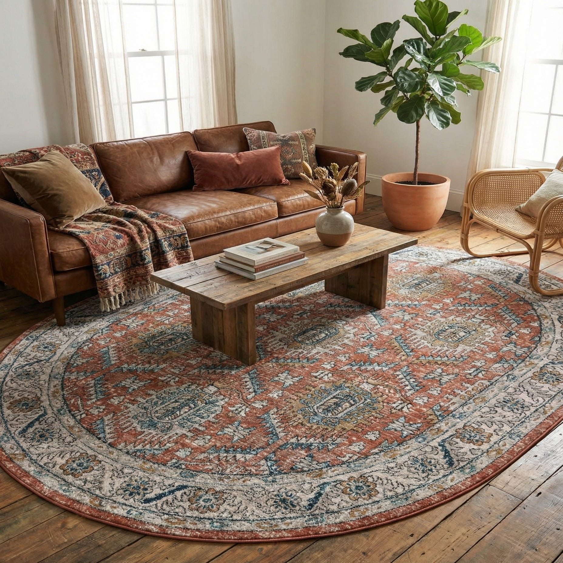 This oval rug works well beneath a round or oval dining table, anchoring conversation areas in a living room, or layered at the foot of a bed to introduce color and pattern. Pair it with natural wood furniture and linen upholstery for a relaxed, cottage or farmhouse vibe, or use the blue and gray accents to connect with coastal, transitional, or eclectic interiors that balance pattern with solid textures.