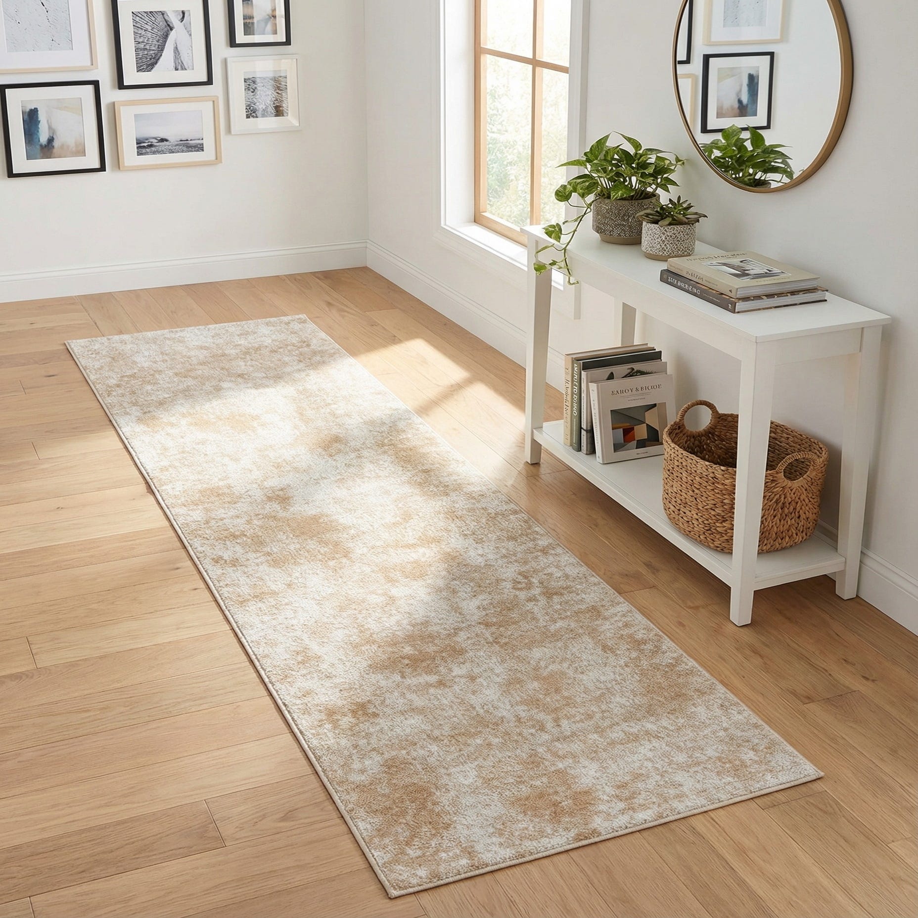 This runner works well in long hallways, beside a bed, or in a kitchen galley where a narrow floor covering can add comfort and cohesion. Pair it with warm wood floors and brass or matte black accents for a modern farmhouse look, or layer it under clean-lined furniture and pale upholstery for a contemporary, minimalist scheme. Its neutral palette also complements coastal and transitional interiors, making it a versatile choice for anchoring narrow spaces.
