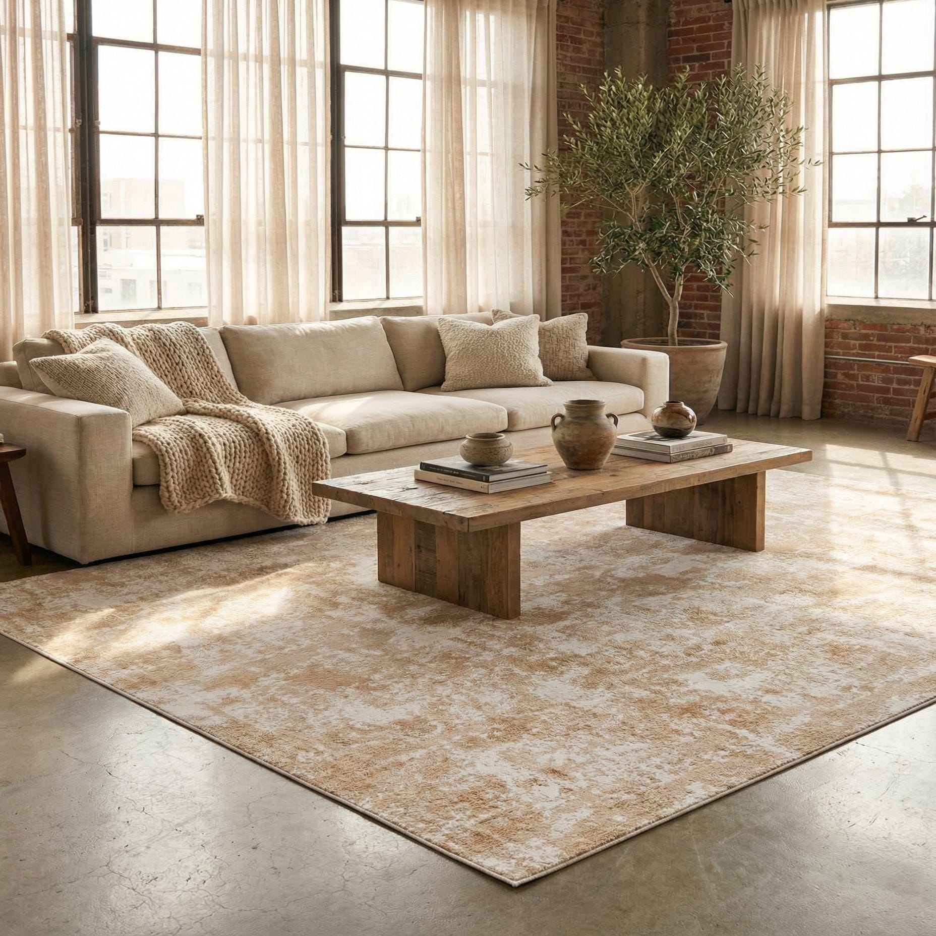 A soft, low-pile machine-made rug woven from 100% polypropylene, this piece has a sand background with irregular ivory markings that create an abstract, gently distressed surface. The pattern is painterly and tonal rather than geometric—subtle shifts in ivory across the sand field give depth without a defined border. Underhand, the rug feels smooth with a slight give; the low pile lays flat and offers a tactile, refined surface that complements both casual and more composed rooms.