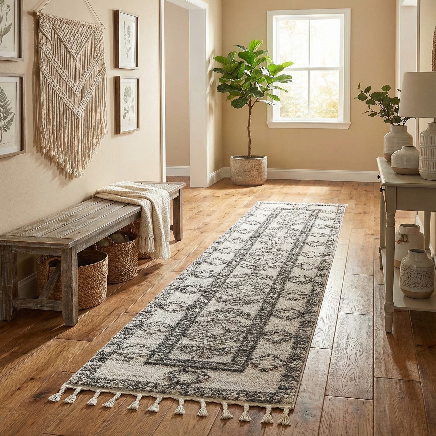 This runner works well in a hallway, entry, or galley kitchen where a narrow, decorative strip is needed to define the path. It pairs naturally with warm wood floors and matte black or iron accents, and fits into transitional, modern farmhouse, Scandinavian, or minimalist interiors that favor layered neutrals. Use it to introduce subtle contrast in a light-colored space or to tie together gray and black accents throughout a room.