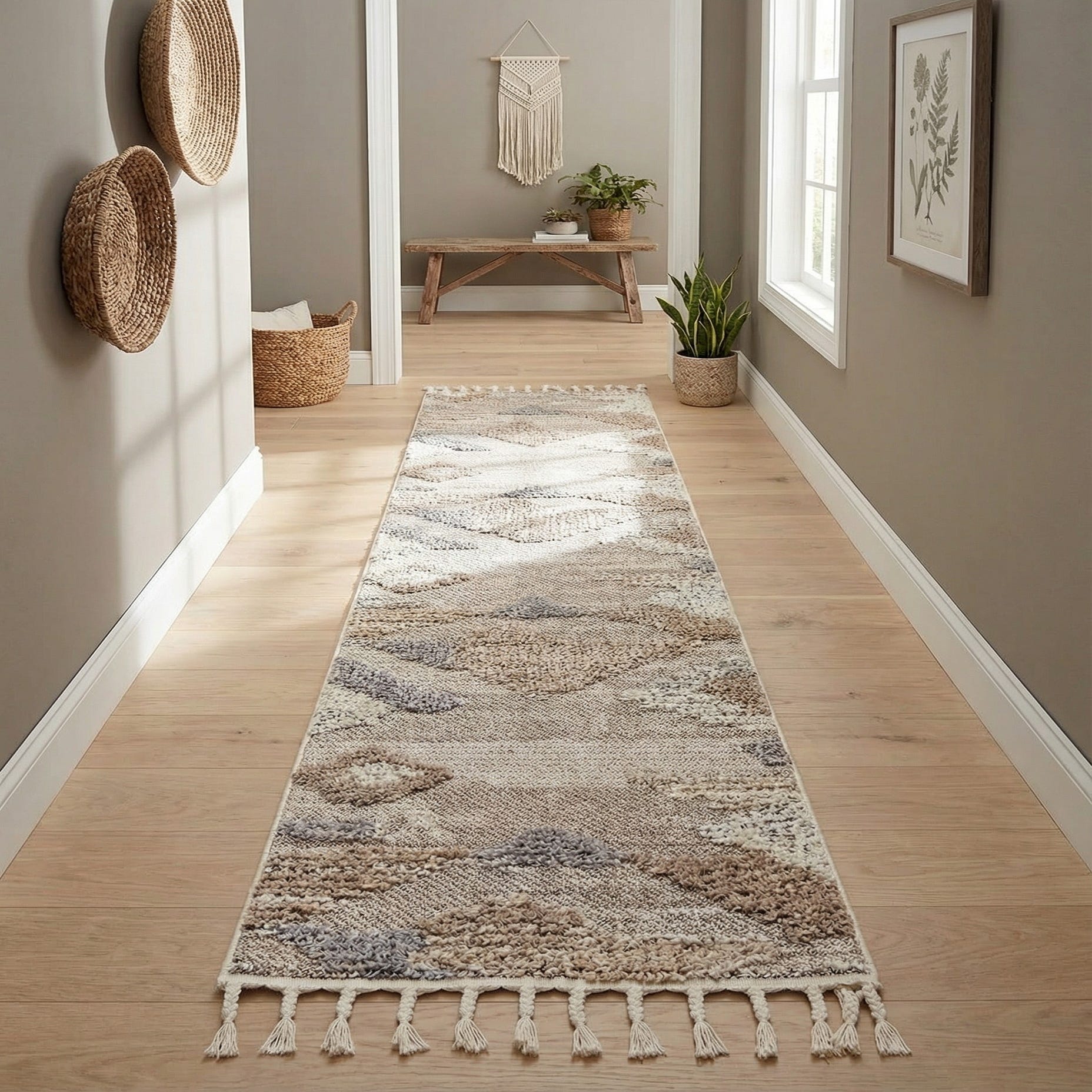 Machine-made from 100% polypropylene, the rug uses a cut-and-loop construction to create alternating plush and low-profile areas you can feel underfoot—raised, nubby diamonds sit against flatter fields for tactile depth and visual interest. The sand, gray, and ivory palette works well in a hallway or entry, as a runner beside a bed, or down a kitchen galley; it pairs nicely with warm woods, pale upholstery, and layered textiles for a cozy, lived-in feel.