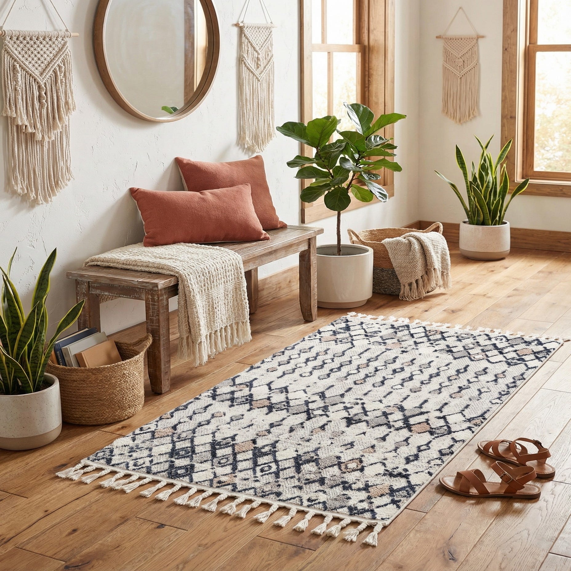 Machine-made from 100% polypropylene, this small-format accent rug fits easily into tight spots where a touch of pattern helps anchor the room. It pairs well with whitewashed wood and rattan for a coastal or boho look, warm leather and painted cabinetry in modern farmhouse schemes, or navy upholstery and light neutrals in transitional spaces. Use it beside a bed, at an entry, layered in front of seating, or to define a cozy reading nook.