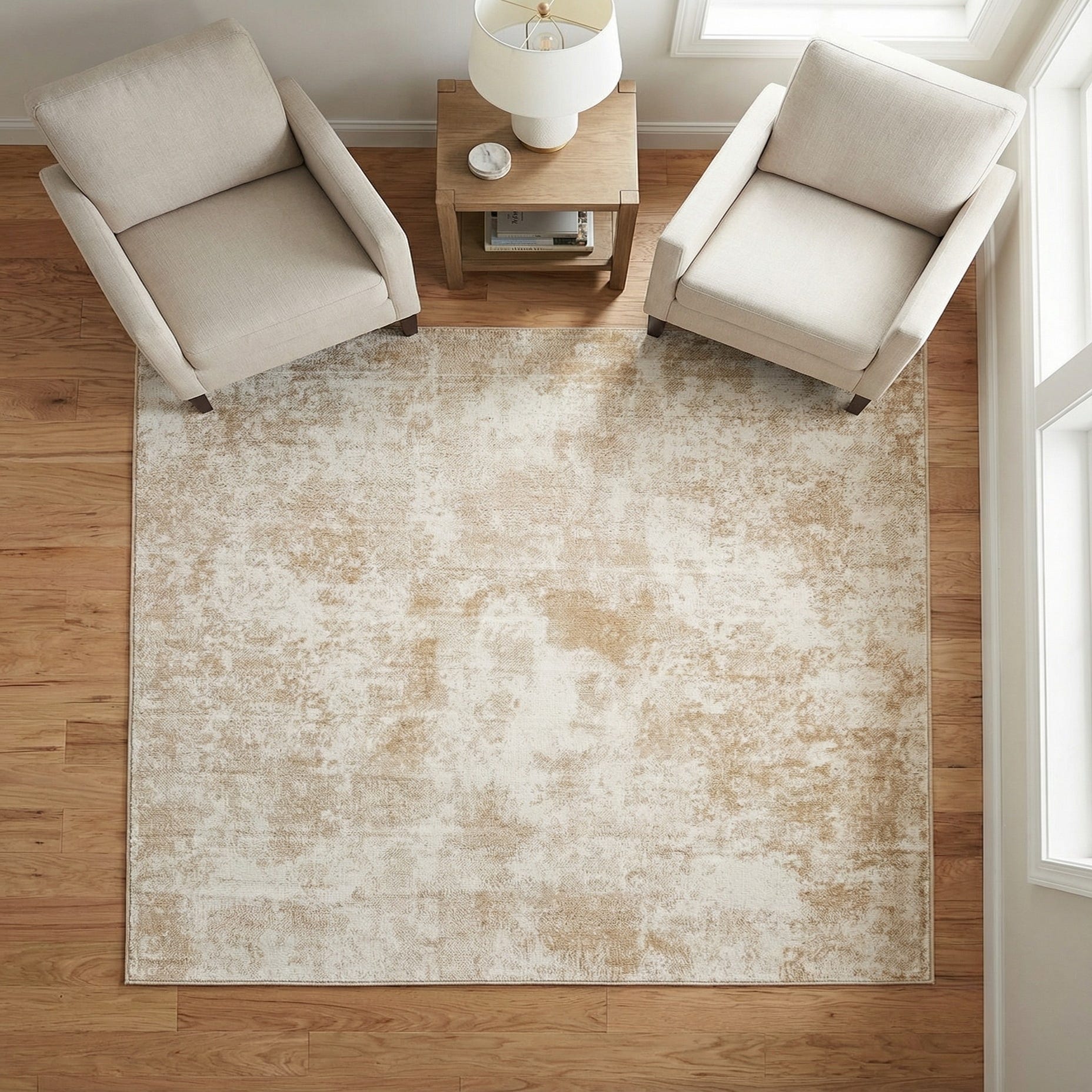 A soft, tonal abstract pattern in sand and ivory creates a gently weathered look that reads modern and relaxed. The sand background is punctuated by irregular ivory mottling that forms a painterly, distressed effect without a defined border or busy motif. The overall style leans contemporary-transitional, offering subtle visual texture that complements both clean-lined and more layered interiors.