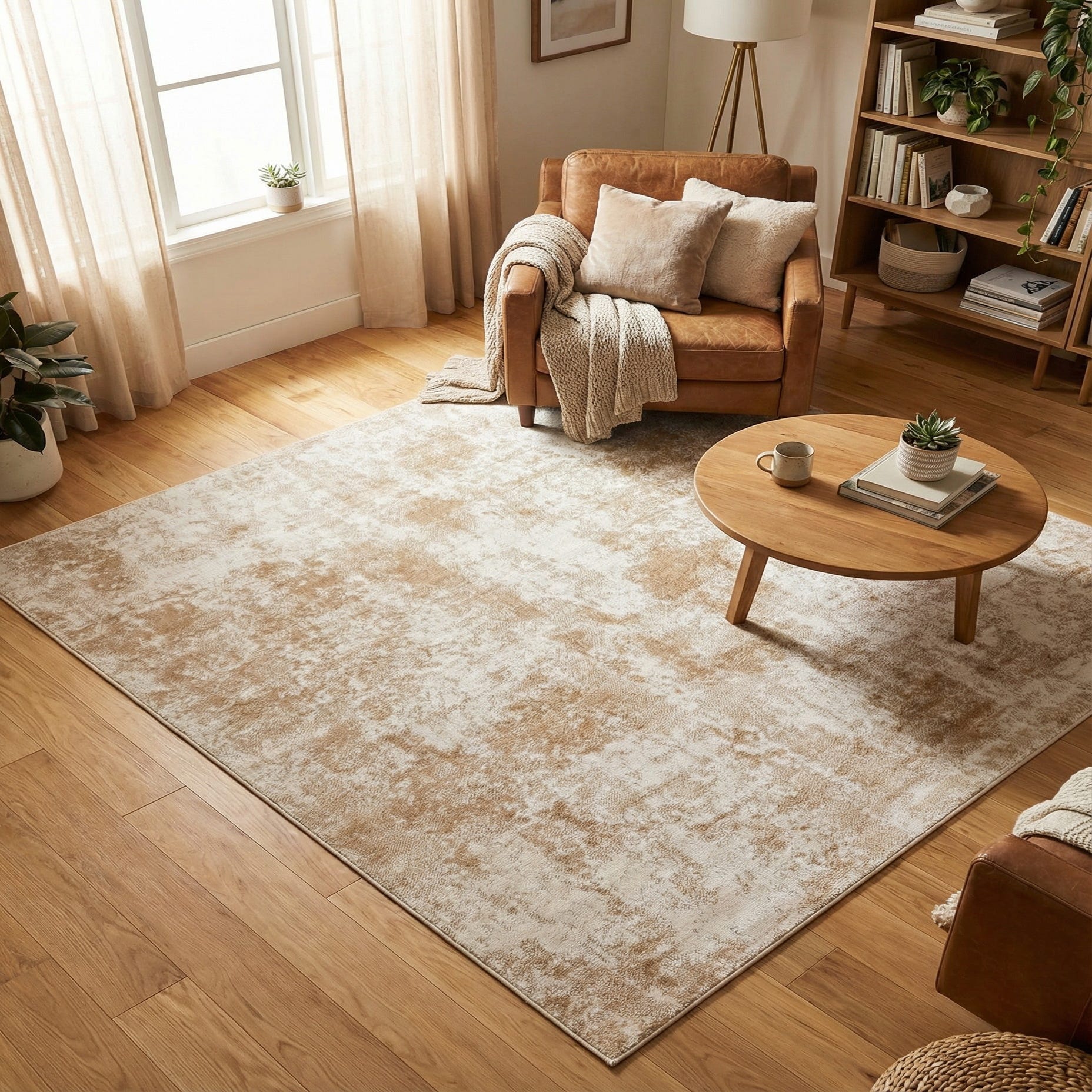 A soft, low-pile rug with a washed, abstract pattern that blends sand and ivory tones for a quietly modern look. The sand background is warmed by irregular ivory patches that create a lived-in, layered effect without a defined motif. Machine-made from 100% polypropylene, the surface has a subtle sheen and a touchable, velvety feel that lays flat and smooth underfoot, offering visual interest through texture rather than bold color or high-contrast design.