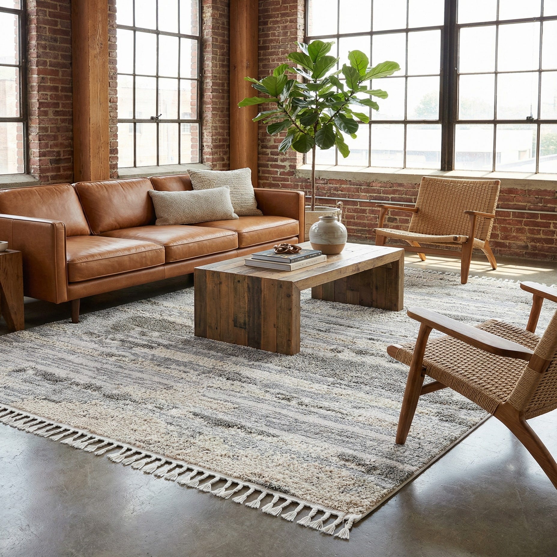 Machine-made from 100% polypropylene, the rug has a low-profile pile with slight variations in height that create a gentle, tactile texture underfoot. Place it to anchor a living room seating area or to define a conversation zone in an open-plan layout; it also works well at the foot of a bed or beneath a small dining table. The neutral sand background and gray accents pair naturally with light wood tones, linen upholstery, brushed metal accents, and coastal, Scandinavian, or transitional interiors that favor calm, layered neutrals.