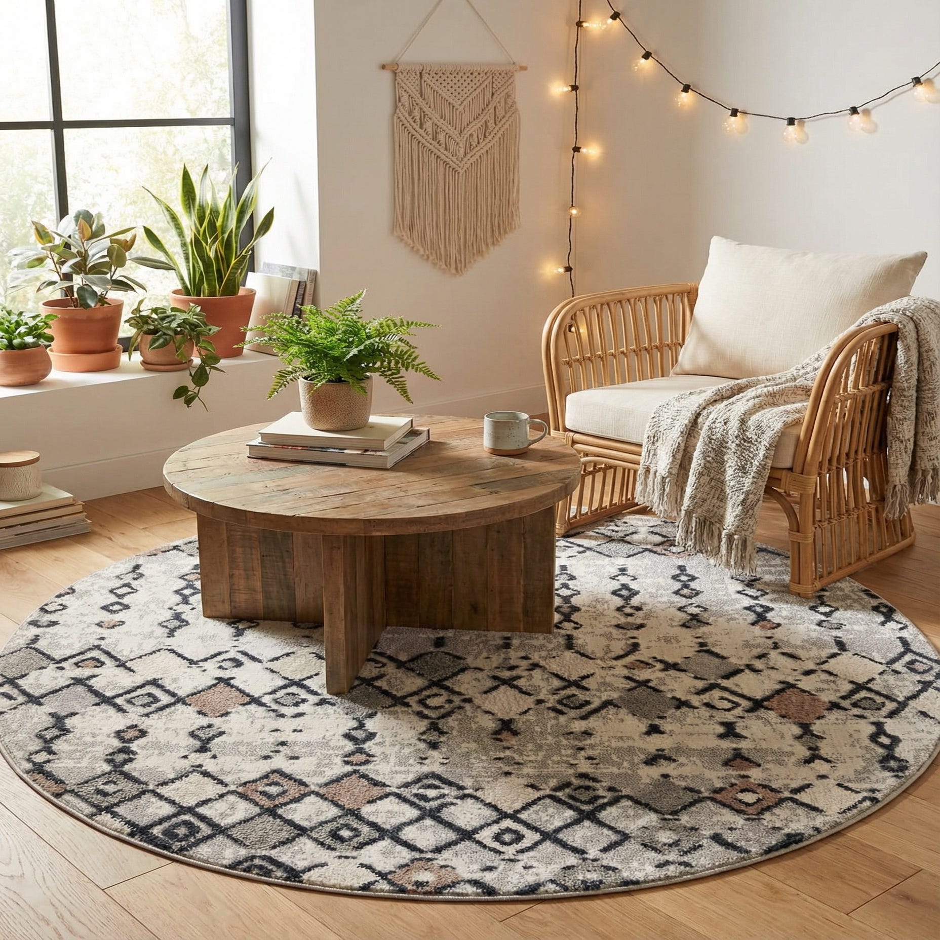 Well-suited to casual contemporary, modern farmhouse, or relaxed boho interiors, this round rug anchors a small seating arrangement or sits neatly beneath a round dining table. Pair it with natural wood furniture, light upholstery, or matte black metal accents to highlight the graphic details, or layer it with solid cushions and throws to introduce soft contrast and warmth.