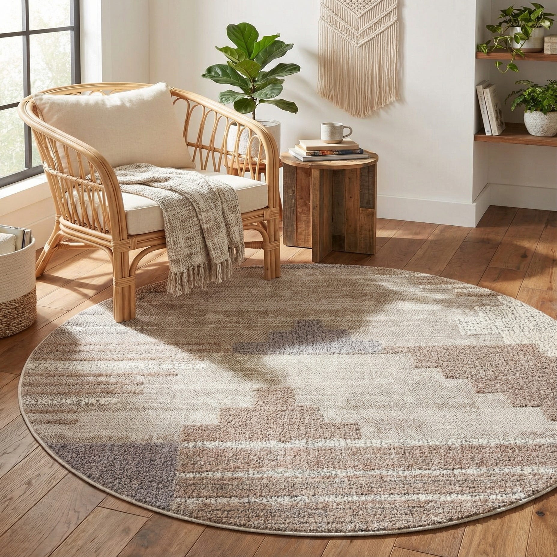 A round rug with a sand background layered with stepped geometric blocks in ivory, gray, and warmer sand tones. The pattern reads like a modern, pixelated motif—horizontal striations and subtle shifts in pile height create depth and gentle movement across the surface. Run your hand over it and you’ll notice a soft, low pile with slight textural variation that gives the rug a tactile, layered feel without adding bulk.