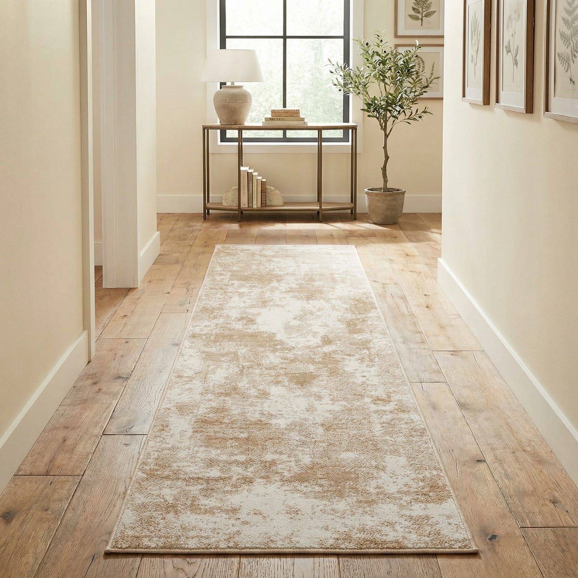 The Aurora Collection offers a chic 8 Ft Runner rug, machine-woven from 100% polypropylene for durability and ease of care. The rug's design is characterized by a minimalist approach, with a subtle pattern that blends harmoniously in sand and ivory tones, creating a sophisticated and versatile appearance. The sand-colored background is accented by lighter distressing, providing a sense of depth and texture that is both visually appealing and tactile.