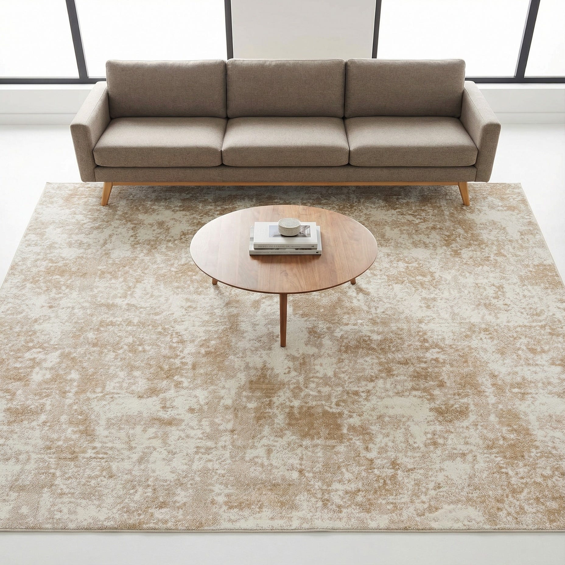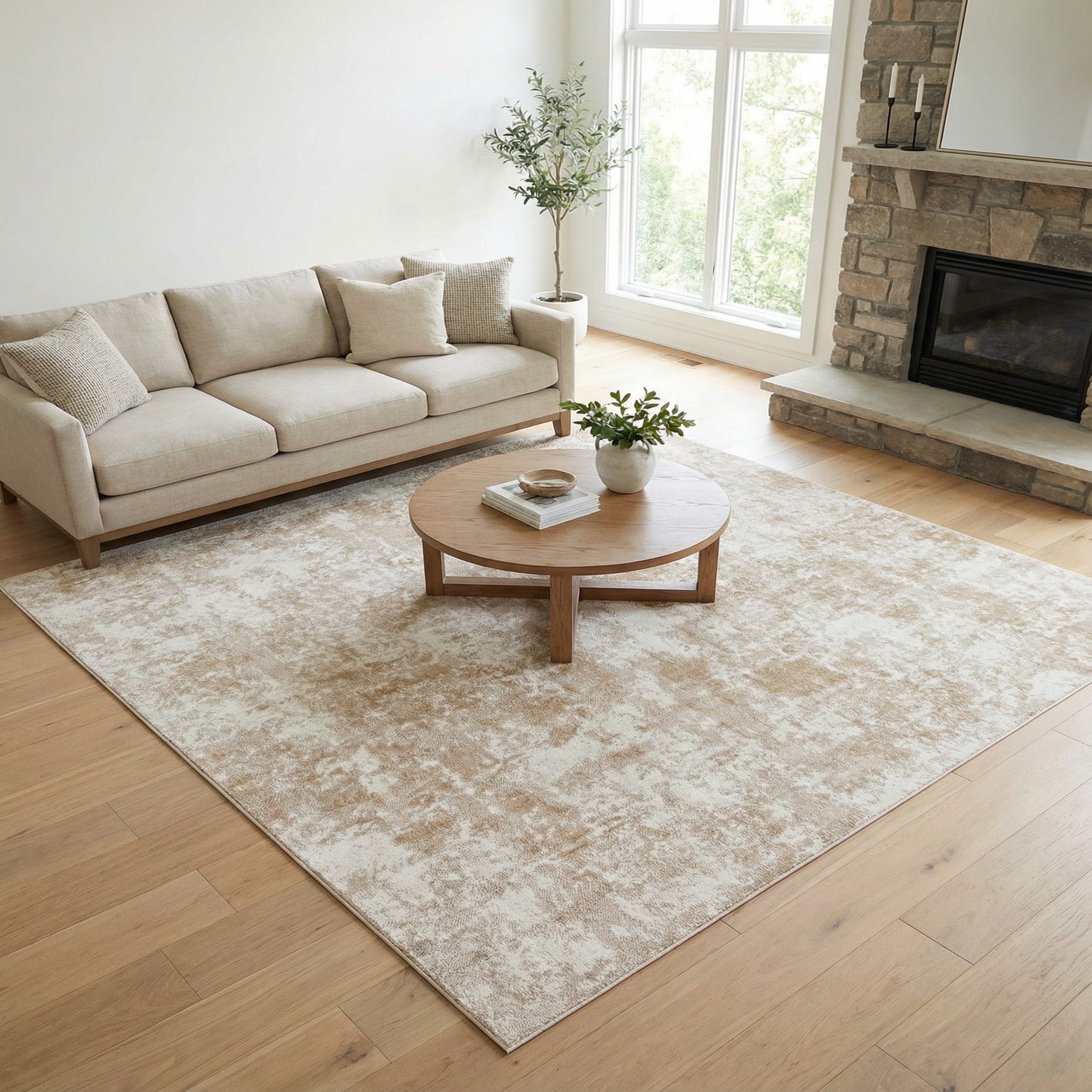 A soft sand background sets the stage for an ivory, painterly abstract pattern that reads as tone-on-tone texture rather than a defined motif. Machine-made from 100% polypropylene, the rug has a low, velvety pile with a subtle sheen—running your hand across the surface reveals gentle variations in texture that catch light and deepen the neutral palette. The overall look is relaxed and modern, with the sand and ivory pairing creating a warm, quiet foundation for a room.