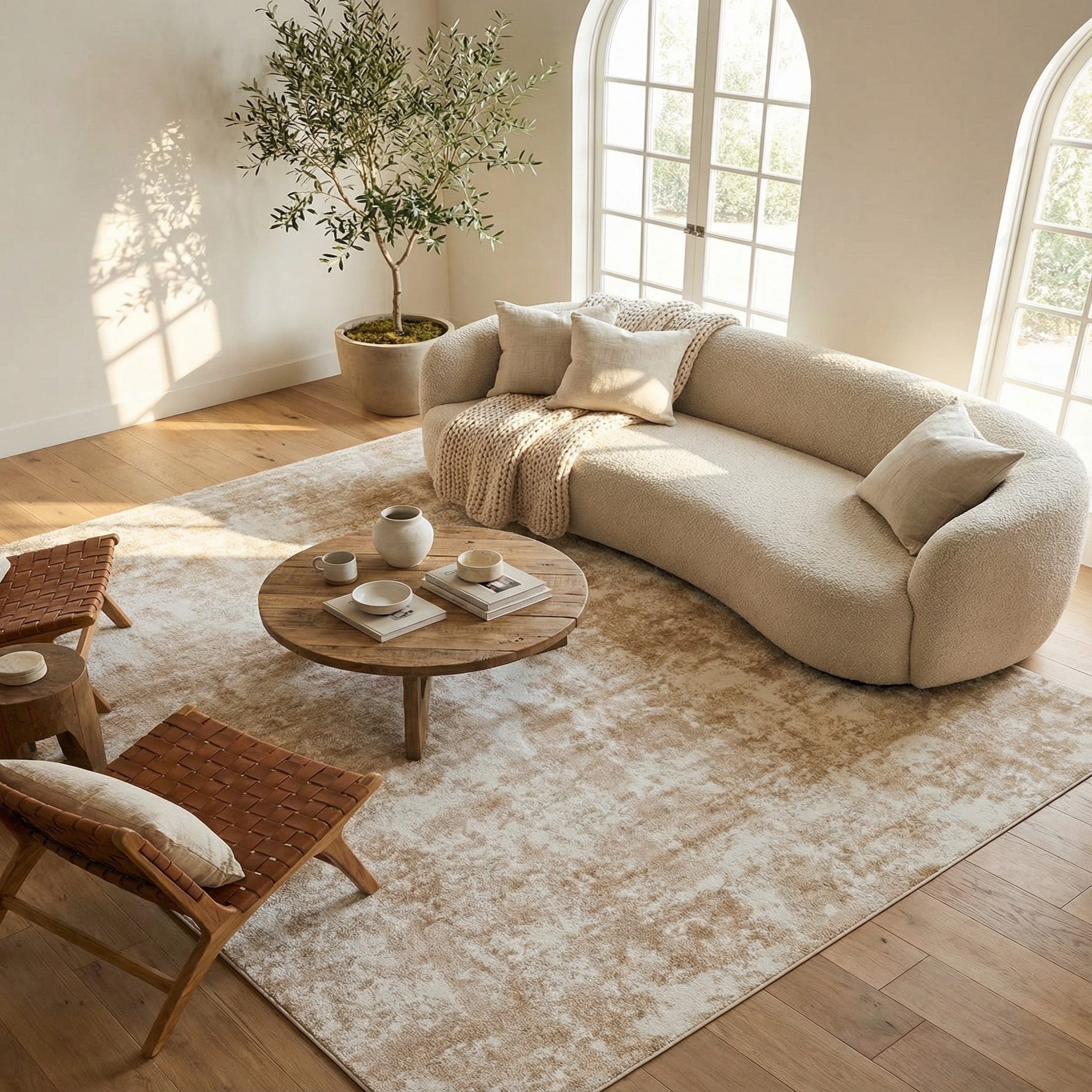 A soft sand background is gently mottled with ivory, forming a subtle abstract, distressed pattern that brings quiet texture to the floor. The low-contrast motif has a lived-in, contemporary feel, while the surface reads smooth and slightly velvety to the touch—low-profile pile that provides a gentle, cushioned underfoot sensation without heavy loft.