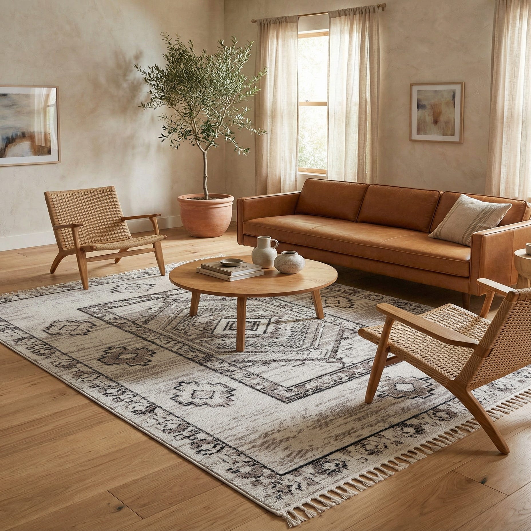 Neutral sand and muted gray tones make this rug versatile across styles — pair it with warm wood and leather for a modern farmhouse look, place it under a clean-lined sofa and metal accents in a transitional living room, or layer it with woven textiles, plants, and mixed patterns for a relaxed bohemian setting. Its balanced pattern and scale make it suited to defining seating areas, anchoring a dining table, or adding quiet pattern to a bedroom.