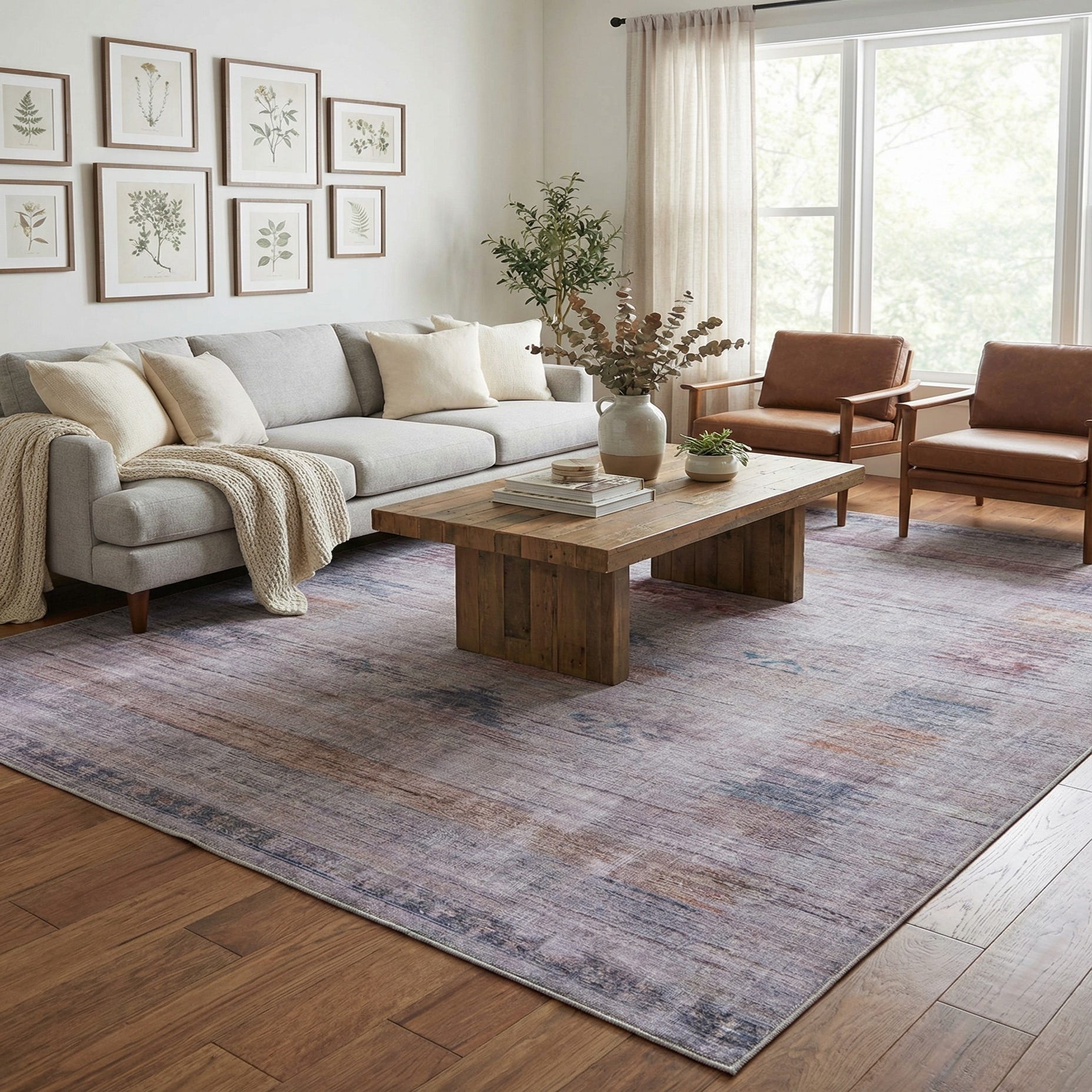 Machine-made from polyester chenille, the surface has a low, plush hand with a slight sheen and a velvety touch underfoot. The palette and texture make it a versatile anchor for a variety of interiors — place it beneath a neutral linen sofa in a relaxed living room, layer it under a wood dining table to soften a contemporary farmhouse setting, or use it in a bedroom to add color without overwhelming other finishes. Its understated coloration works well with warm wood tones, painted cabinetry, and mixed-metal accents.
