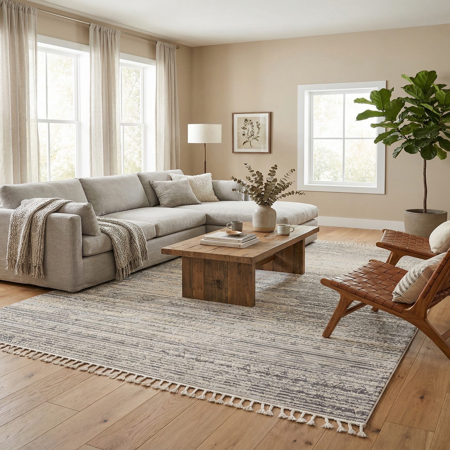 This versatile palette and texture suit a range of interiors: place it beneath a light-wood dining table to warm a coastal or Scandinavian dining room, anchor a neutral living area with linen sofas and woven accents, or layer it in a bedroom alongside rattan furniture and soft textiles for a relaxed, modern-boho feel. The subdued gray and beige tones pair well with both warm woods and cool metal finishes, making it an easy foundation for evolving decor.