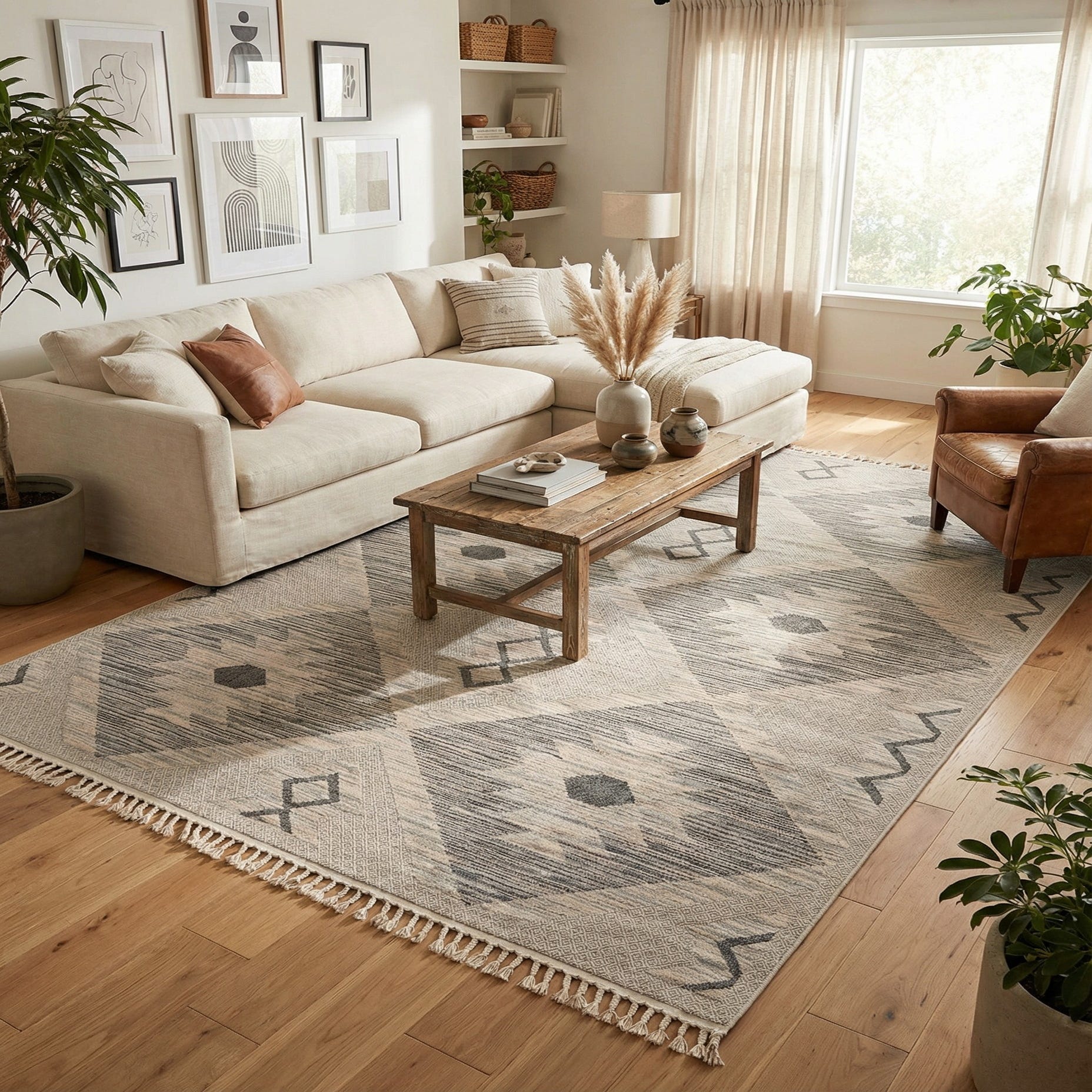 Warm neutrals and layered textures pair naturally with this design. Use it to ground a living area beneath a sofa and coffee table, as a textured layer under a dining table, or to bring pattern into a bedroom or entryway. It complements Scandinavian and coastal palettes as well as modern farmhouse and casual boho schemes when combined with natural woods, rattan, linen upholstery, and charcoal or slate accents.