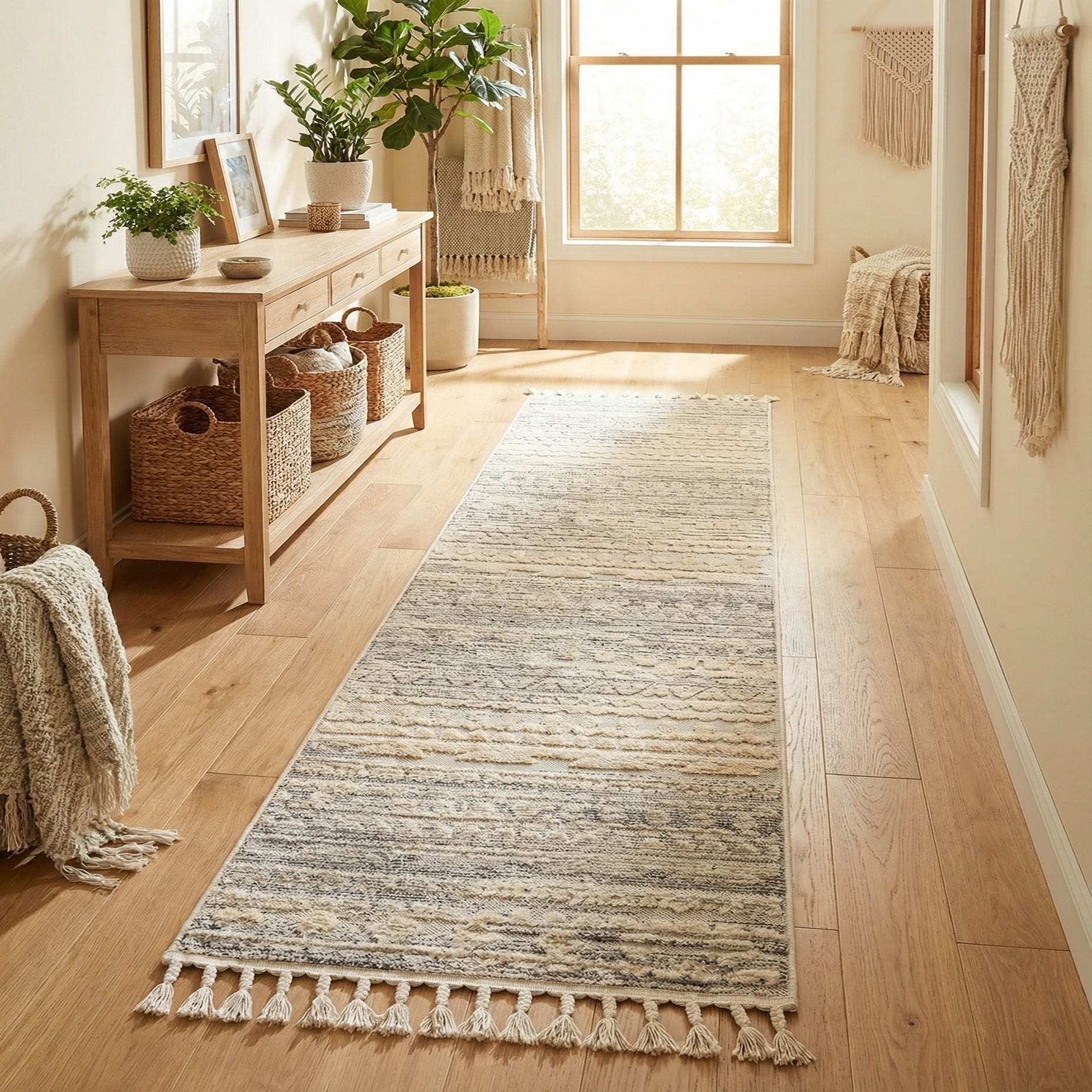 This runner works well in narrow traffic areas where you want a neutral base with visual interest — think entryways, hallways, or alongside a bed. Its muted palette and organic motifs pair easily with coastal, Scandinavian, modern farmhouse, or relaxed bohemian schemes; pair it with light woods, linen textiles, and matte metal accents to emphasize its soft, layered look.