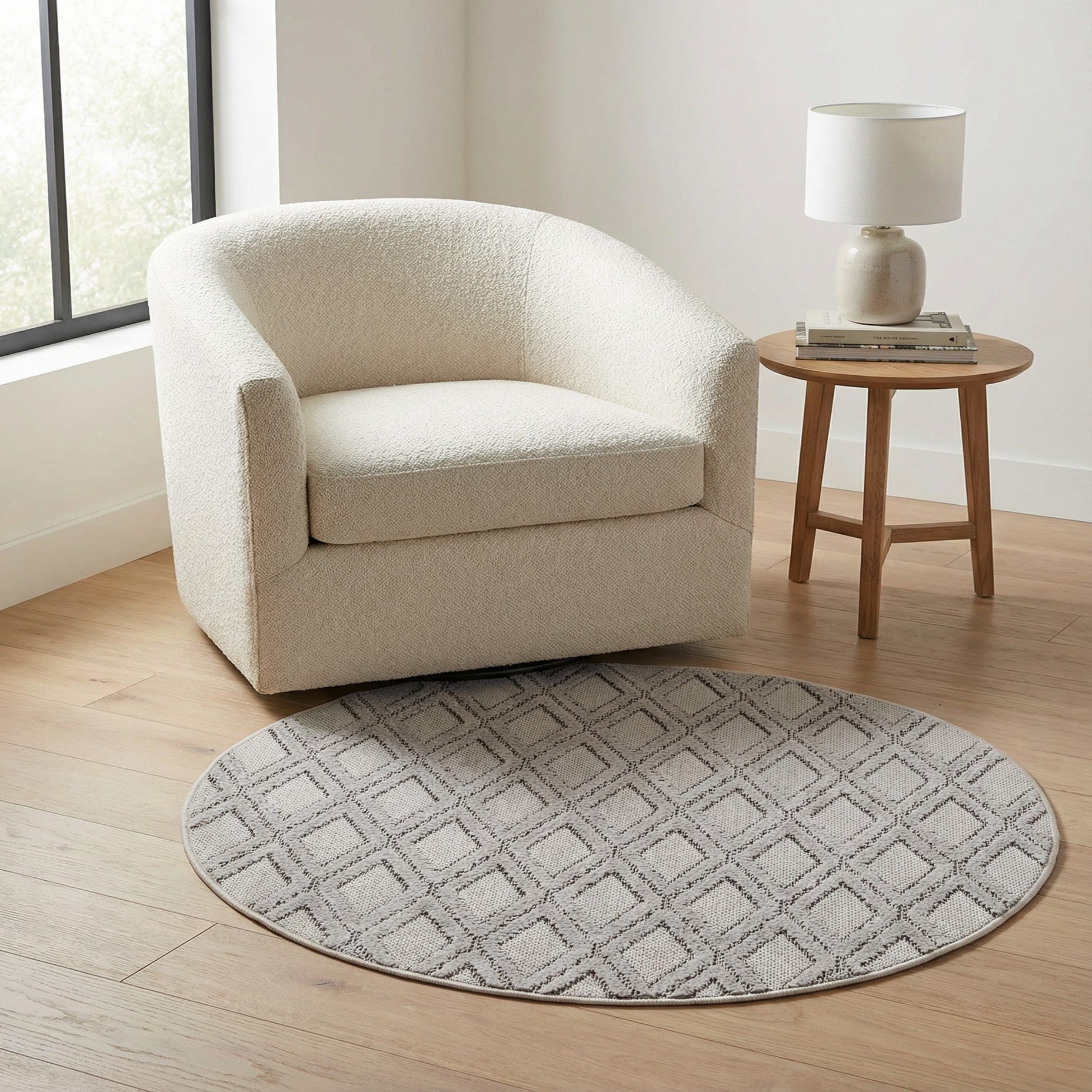 This versatile design works well in a range of interiors: place it beneath a small dining set or bistro table to anchor a cozy nook, layer it in a living room for added pattern without overwhelming neutral décor, or set it beside a bed to bring soft texture to a bedroom floor. The neutral palette and geometric motif suit modern farmhouse, Scandinavian, coastal, or transitional schemes where calm, understated patterning is desired.