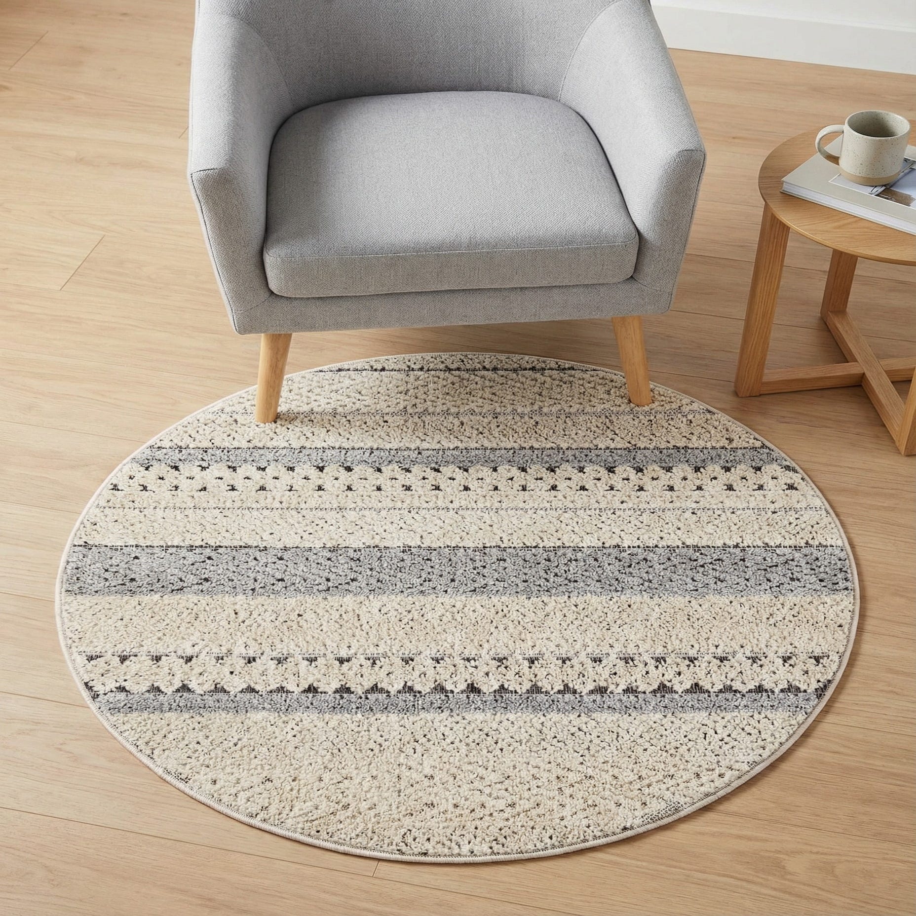 Machine made from 100% polypropylene, this rug offers a consistent texture and color that fits easily into everyday settings. It pairs naturally with light wood and linen upholstery for Scandinavian or coastal interiors, and the neutral tones also complement modern farmhouse and contemporary rooms. Place it under a small round table, in a cozy reading nook, or beside the bed to introduce warmth and understated pattern to compact spaces.