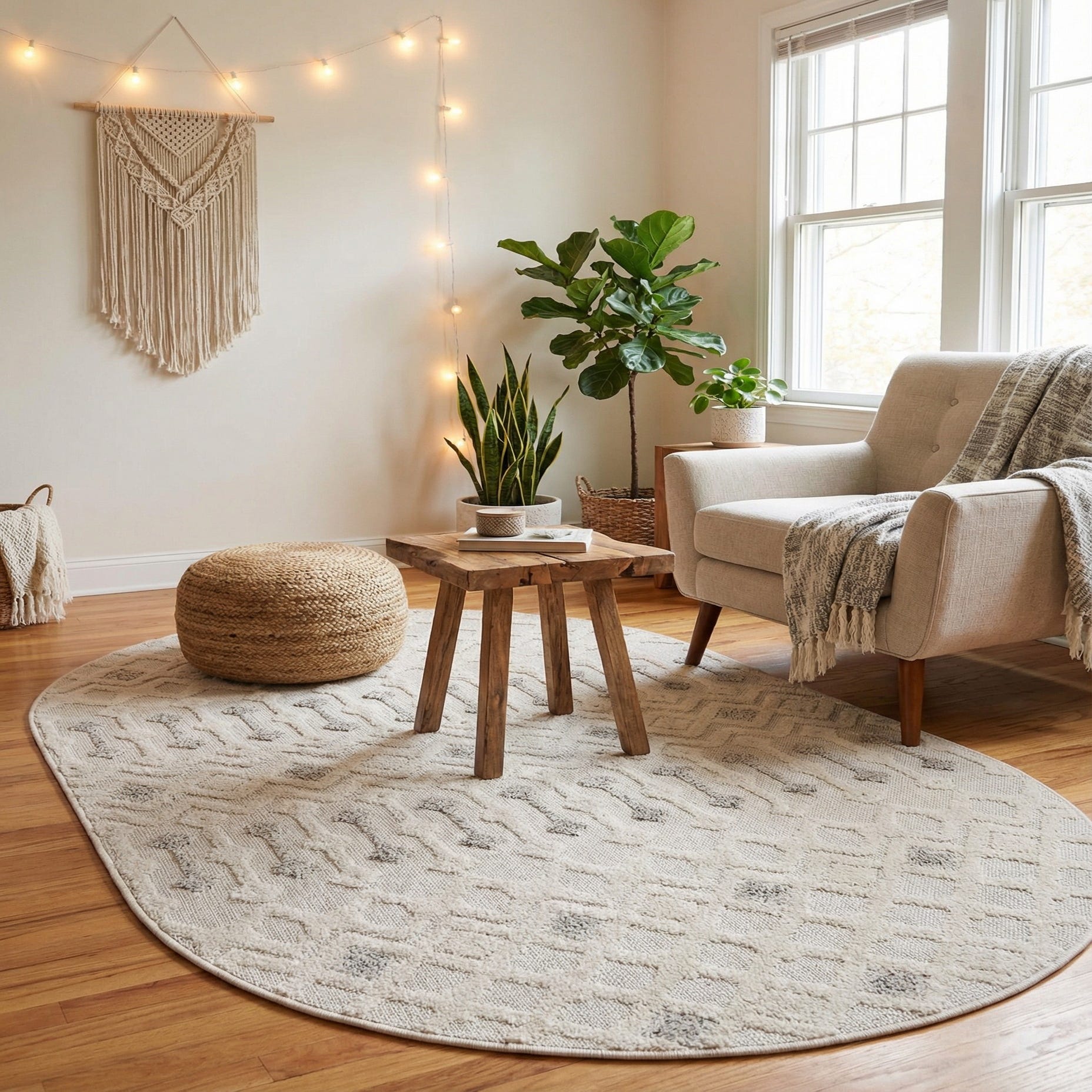 A Sandy Beige ground provides a soft, neutral canvas accented by warm Beige and cool Gray motifs. The design blends a subtle diamond trellis with rows of elongated keyhole-like marks for a quiet, geometric rhythm across the oval. The surface has a low, looped pile with slightly raised patterning, so you can feel a gentle texture underfoot without added bulk.