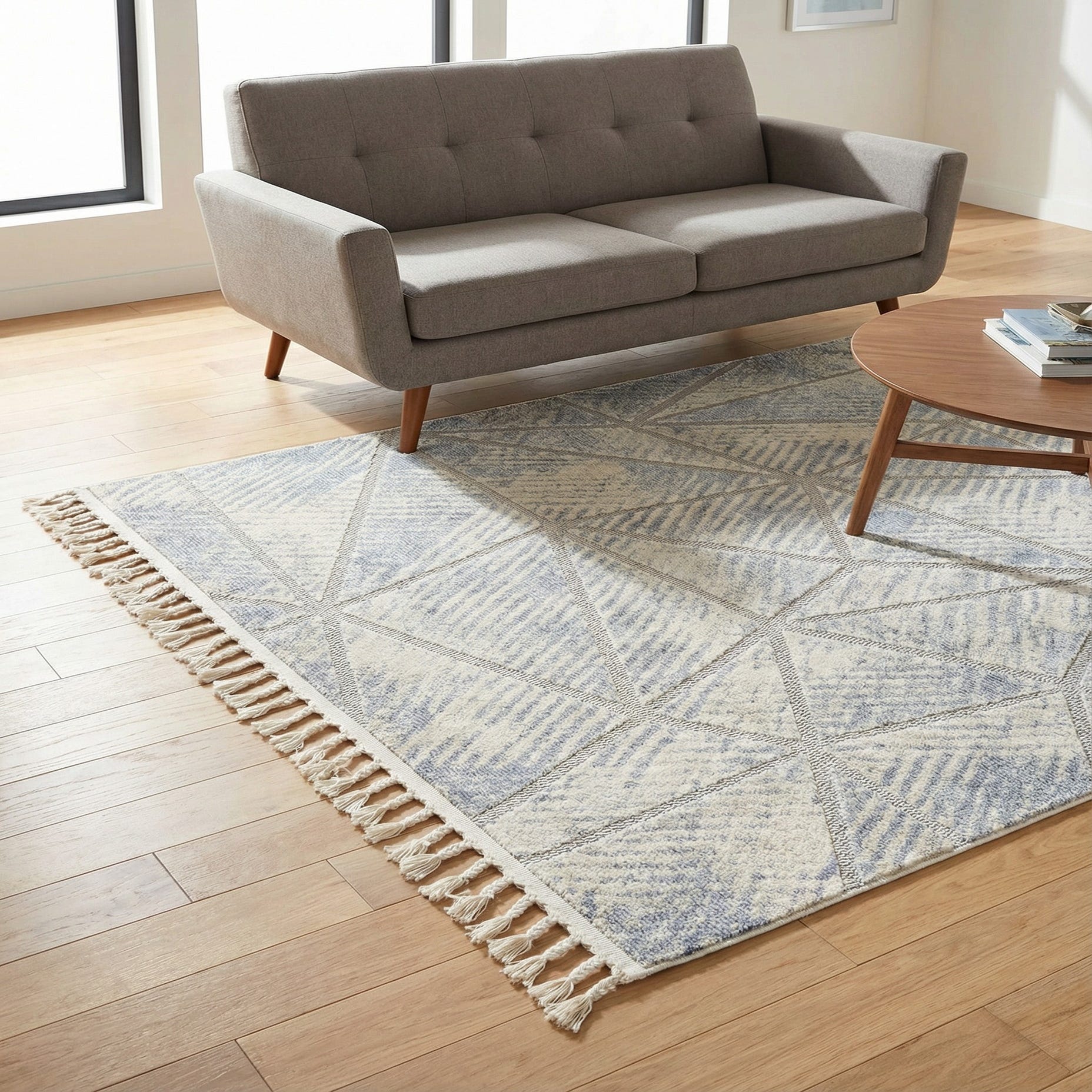 Work this rug into light-filled living rooms, coastal or Scandinavian-inspired bedrooms, or a transitional dining area where a neutral, patterned grounding piece is needed. It complements pale woods, white or gray cabinetry, and soft blue-gray upholstery, and it also layers well over hardwood or tiled floors to soften and define seating zones.